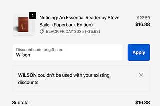 Passage Press is selling my $29.95 anthology "Noticing" for $23.60 on Friday, November 28, including domestic shipping.
