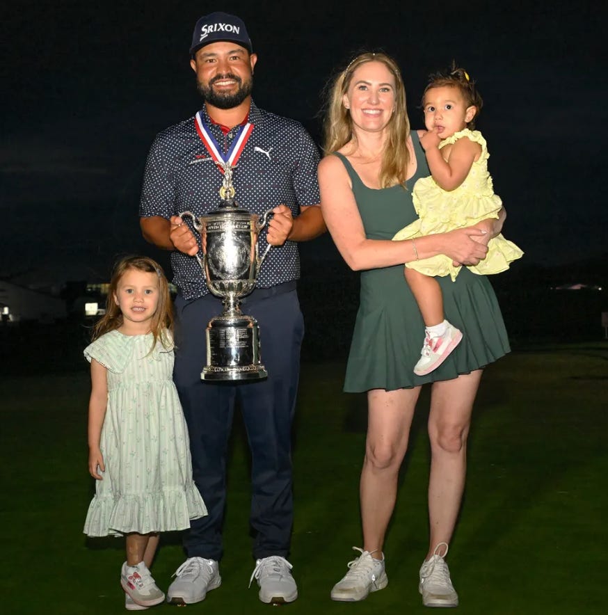 Spaun has a German-American father and a half-Filipino and half-Mexican mother. But unlike Keanu Reeves, he didn’t get quite as obviously as triumphant of a combinations of genes, so he’s had to plug along having his potential underrated until this year at age 34 when he lost a playoff for the #5 tournament, the TPC, to superstar Rory McIlroy, and then won the national championship at the prototypical U.S. Open course, Oakmont.