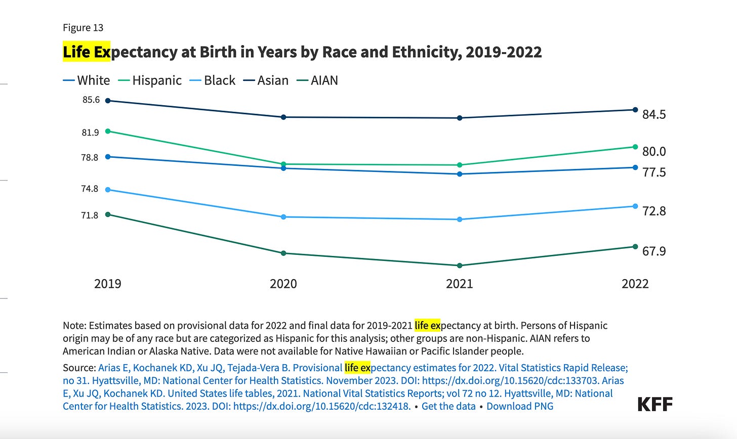 Back in 2019, before covid, the George Floyd racial reckoning murder and car crash binge, and the further rise of fentanyl, Asians and Hispanics were the longest lived Americans, with Latino-Americans enjoying 3.1 years more life expectancy at birth than whites, and Asians living 6.8 years longer than whites.