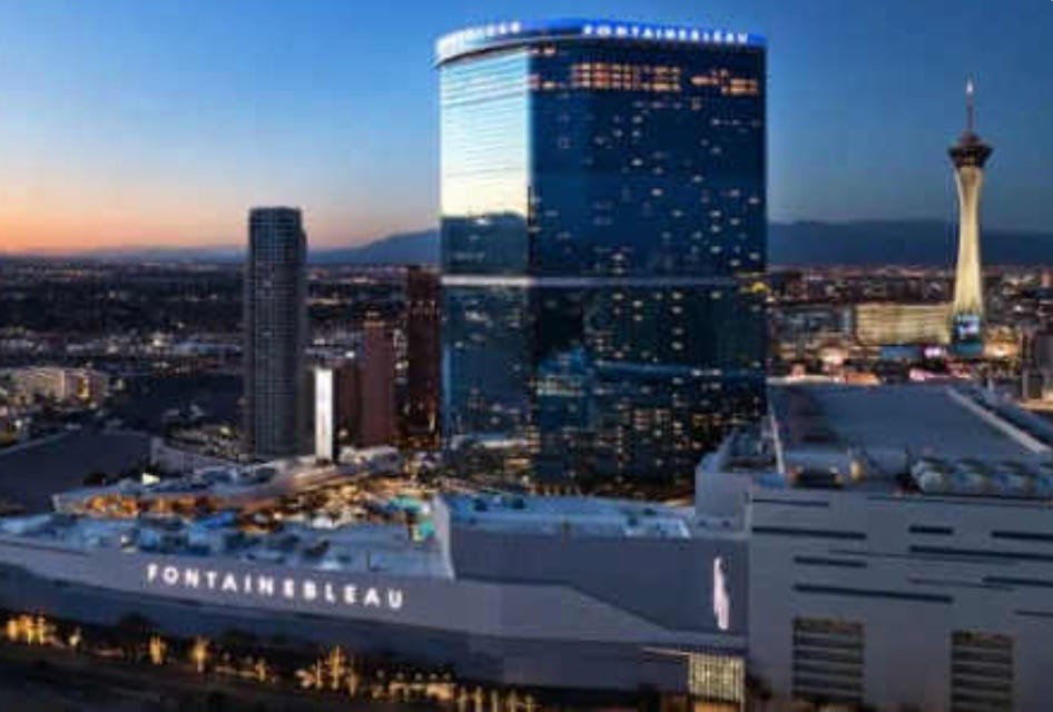 The tallest building in Las Vegas is either, depending upon how you define “building,” either the 1,149 foot Strat tower or the recent 737 foot Fontainebleau hotel.