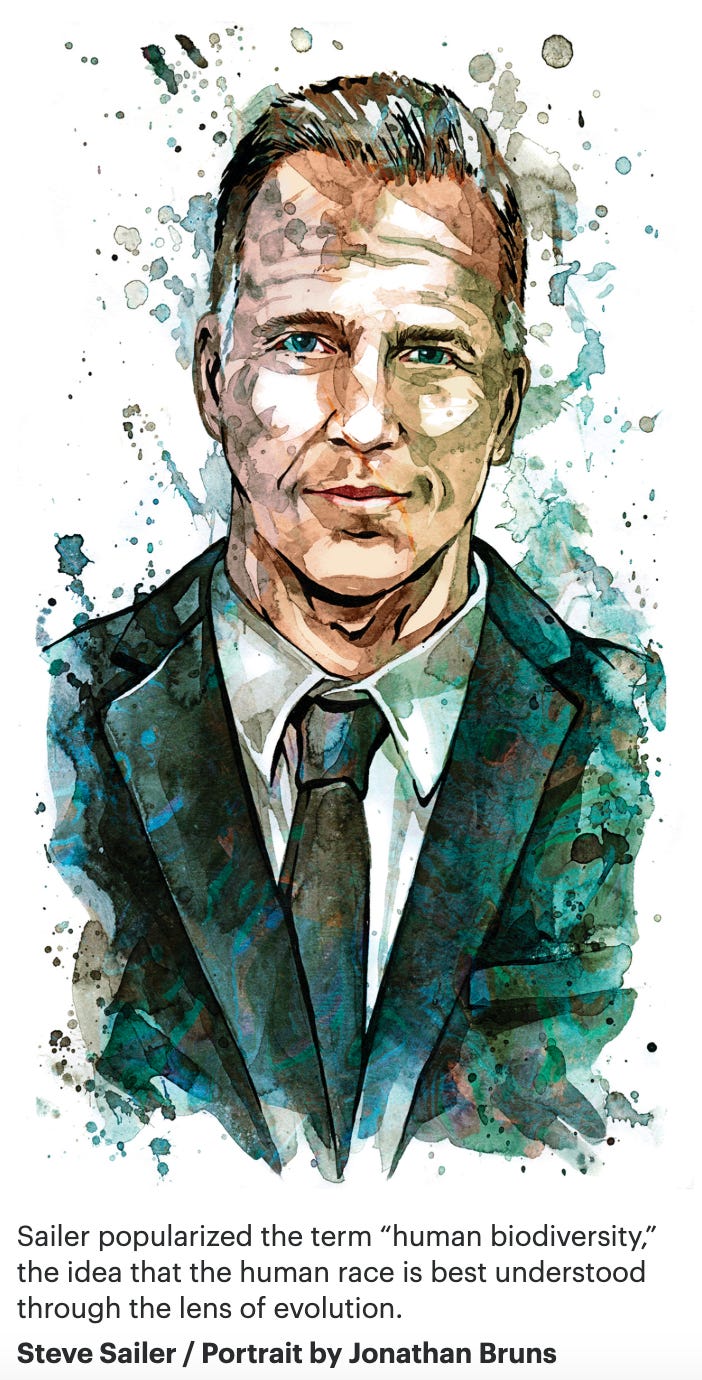 Sailer popularized the term “human biodiversity,” the idea that the human race is best understood through the lens of evolution. He claims he’s basically a sports fan, noting that some races tend to do better in certain sports and playing positions. “I just employ the kind of thinking that’s not terribly controversial in the sports world to more politicized questions about society, such as education or crime.” He has written about racial differences and test scores. He’s also reported that FBI data shows that 60% of known homicide offenders are African American.