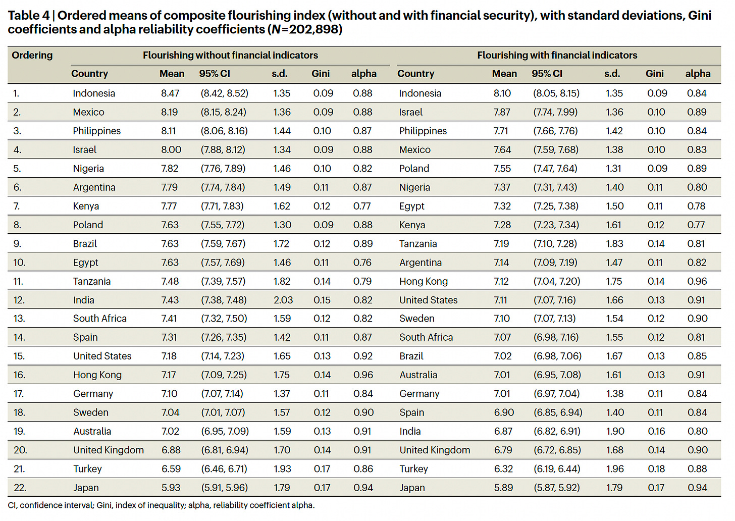 The US is #12, in the middle of this list, just ahead of Sweden. White countries tend to be toward the bottom (e.g., UK trails India), with the Japanese as the least flourishing people among the 22 countries.