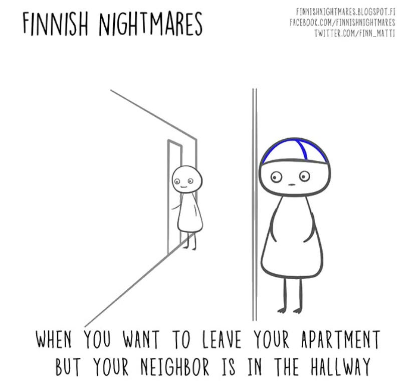 Still, are Finns really the happiest people on Earth? They seem kind of serious, even glum, at least when sober. The website Finnish Nightmares documents the difficulties of being a Finnish-class introvert: