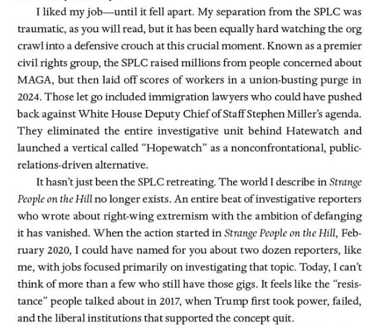 were alarmed that their town might become publicly associated with the far right, and they invited Hayden, then a researcher for the Southern Poverty Law Center (SPLC), to come speak to them and report on what was happening. He befriended residents and documented what became a multiyear unraveling – of the town, where neighbor turned against neighbor; of VDare, whose existence came under increasing financial and legal pressure; and of the SPLC, where internal divisions about strategy and labor practices were boiling over. In the course of what became this book, Hayden also suffered a mental health crisis compounded by the strain of years of reporting on the far right.