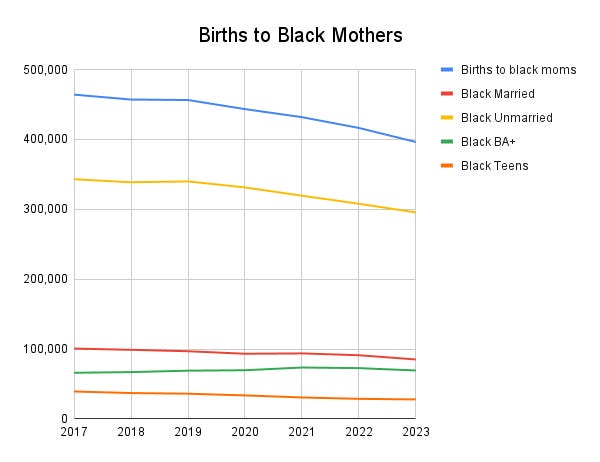 In contrast, from 2017 to 2023, for example, births to white teen mothers were down 38% from 2017 to 2023, while births to black teens fell 29%.