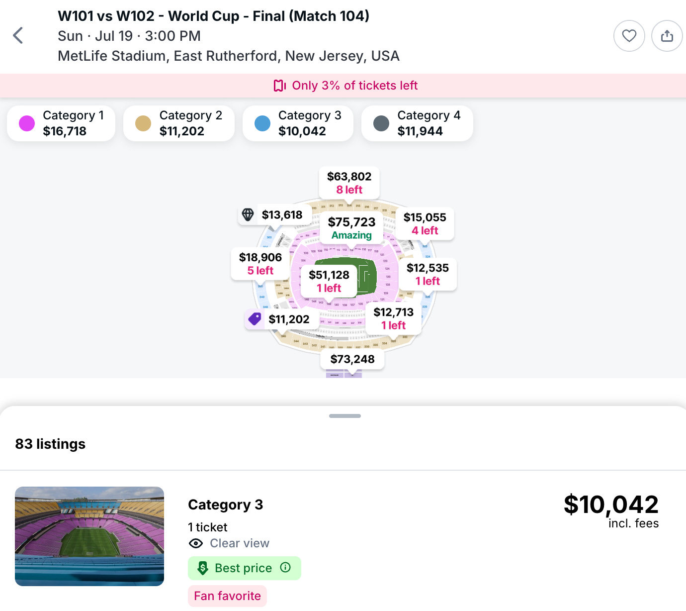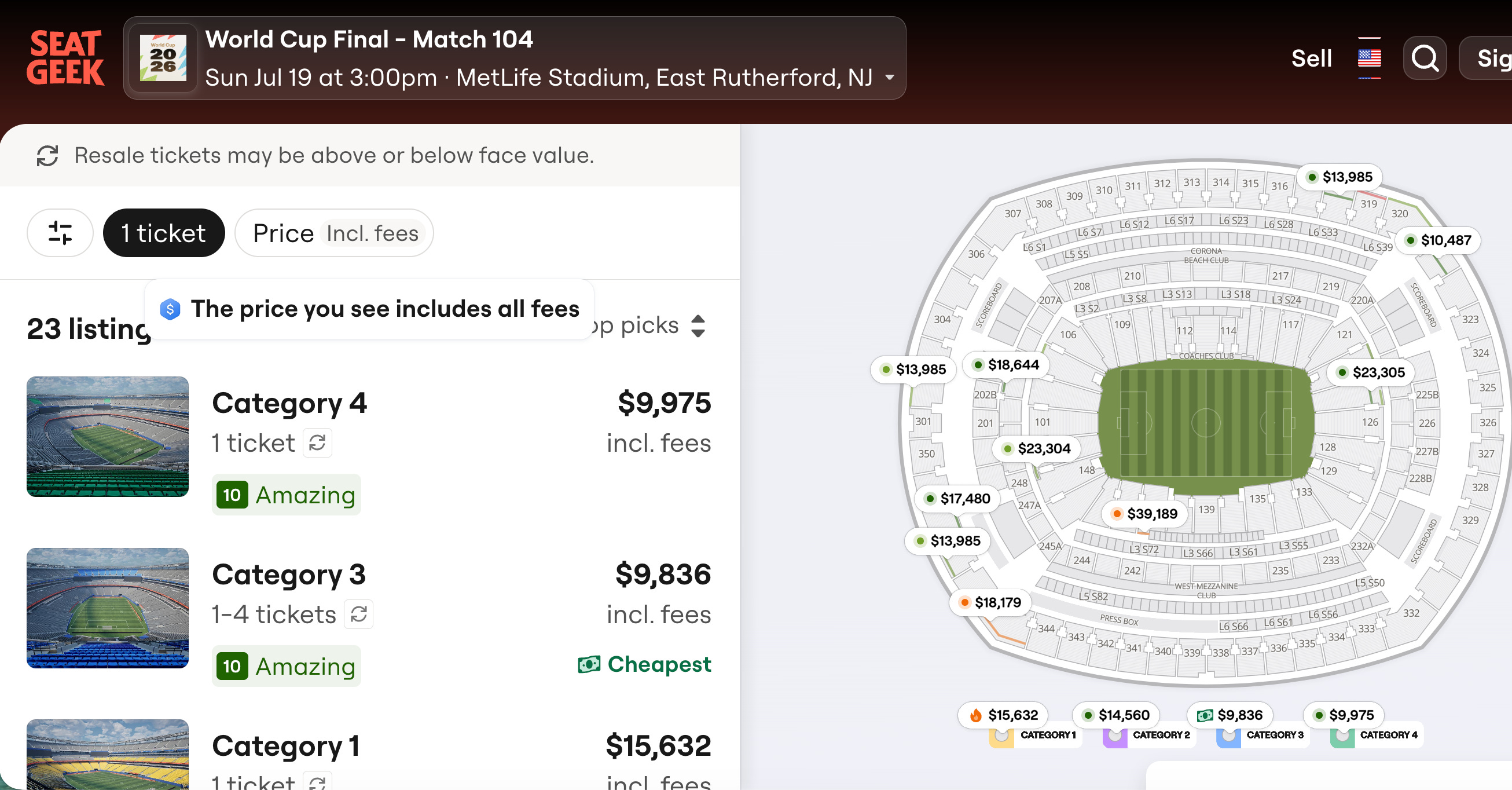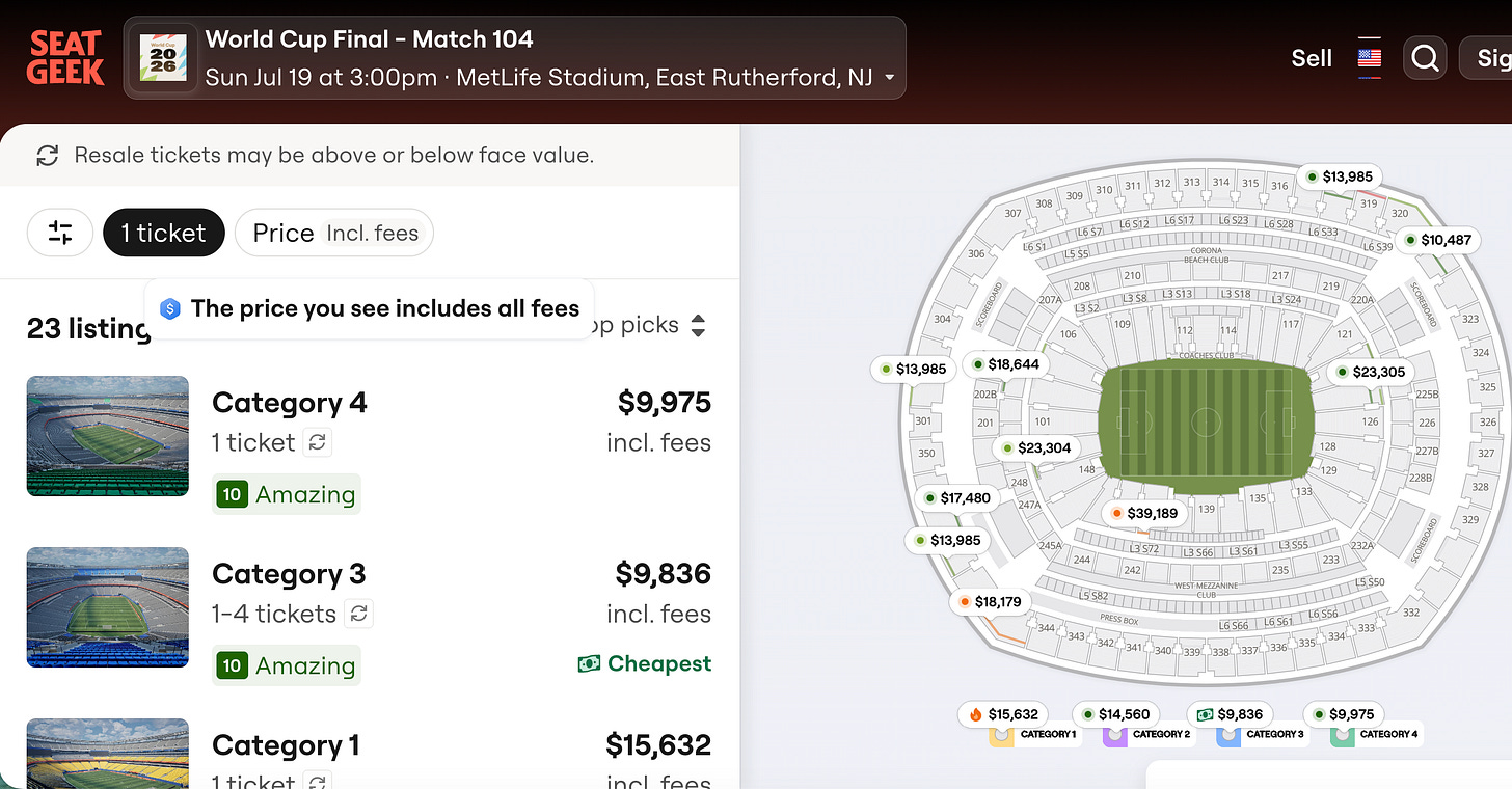 For example, currently the cheapest single ticket to the soccer World Cup final match in suburban New York City on Sunday, July 19, 2026 is being offered for resale by scalpers for right around $10,000. Seat Geek is asking just under 5 digits: