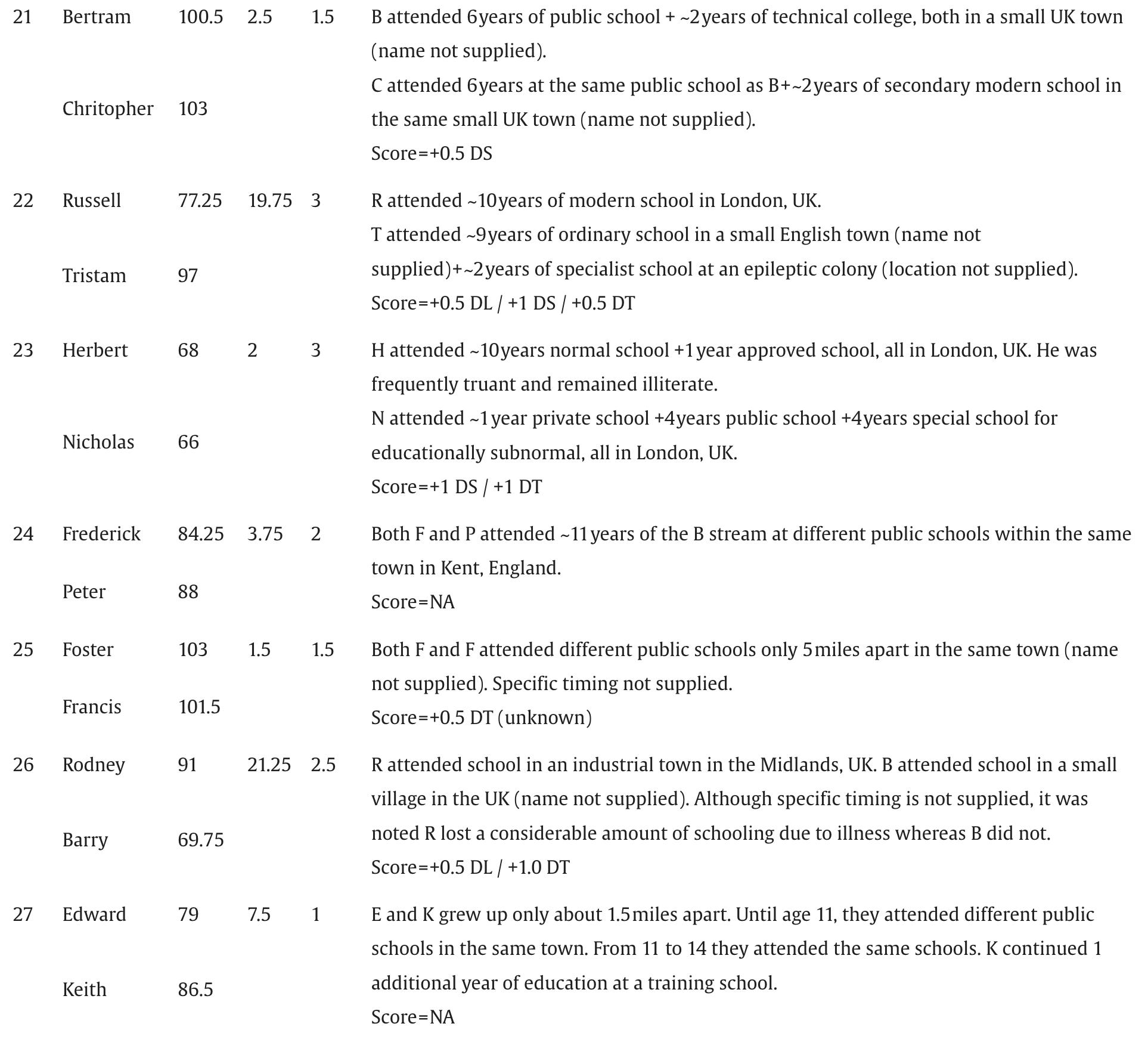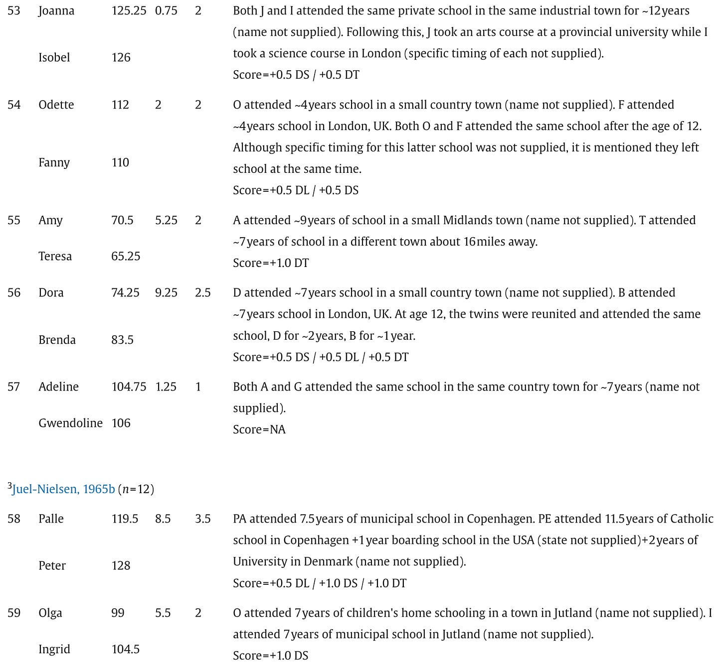 Probably the most valuable datapoints are 71 and 72. They are the two sets of Colombian twins described by Nancy Segal who got switched in the maternity award and each pair grew up thinking they were fraternal twins. One inadvertently mixed pair grew up in a rural town while the other mixed pair grew up in the big city. Neither knew of the existence of their identical twins. As young adults all four lived in Bogota, where they were reunited by friends of their twins stopping them on the street to converse with their look-alikes.