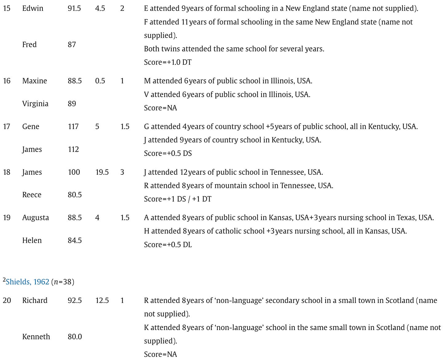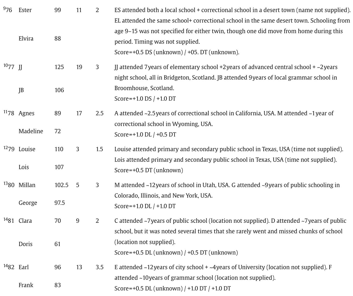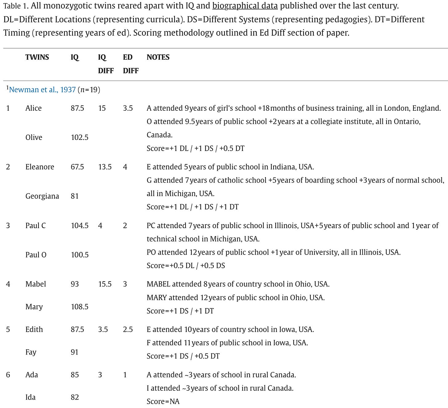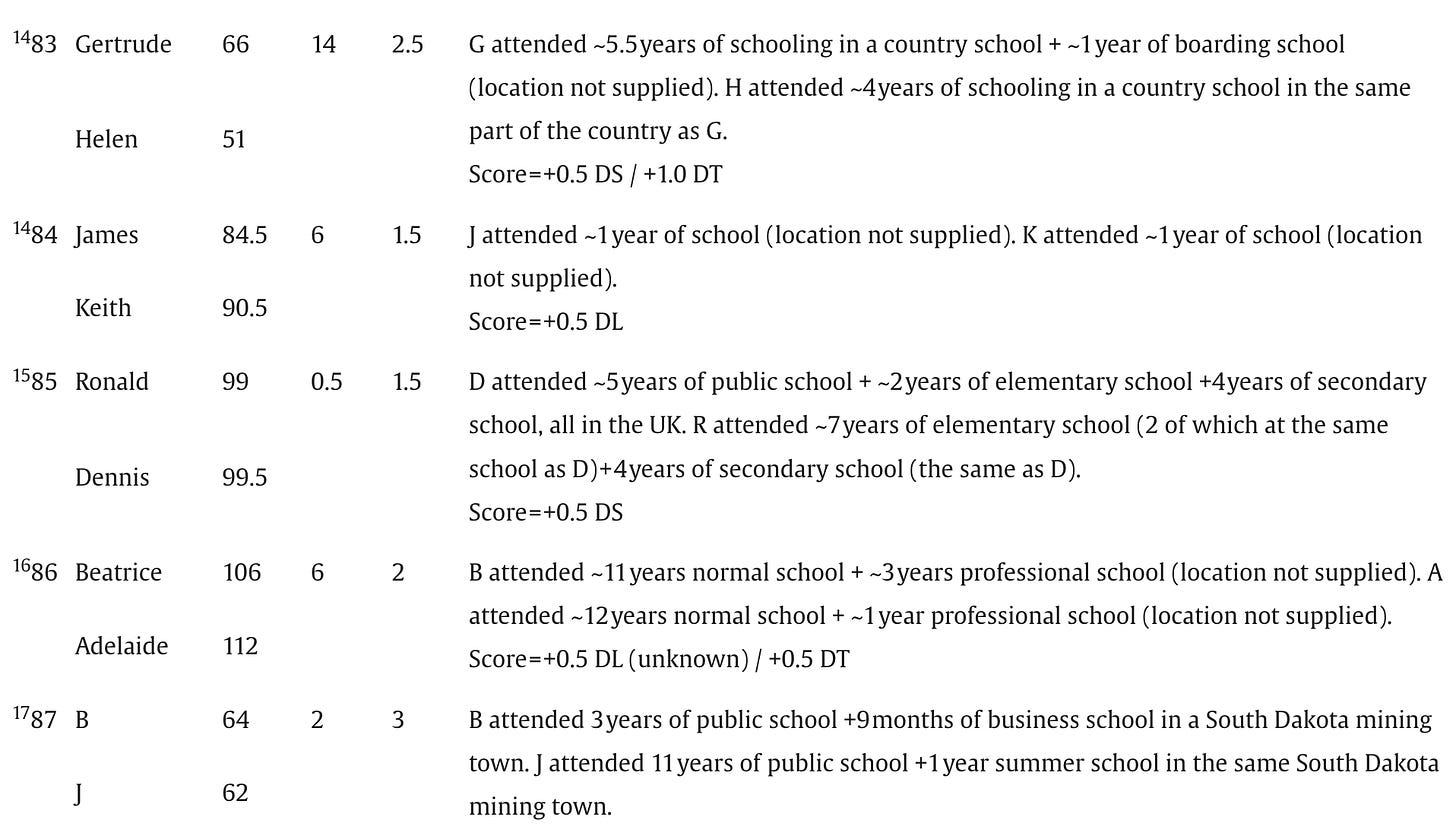 Below are the screenshots of the summaries of IQs and schooling for the 87 pairs of identical twins raised apart that appear in Acta Psychologica, July 2025: