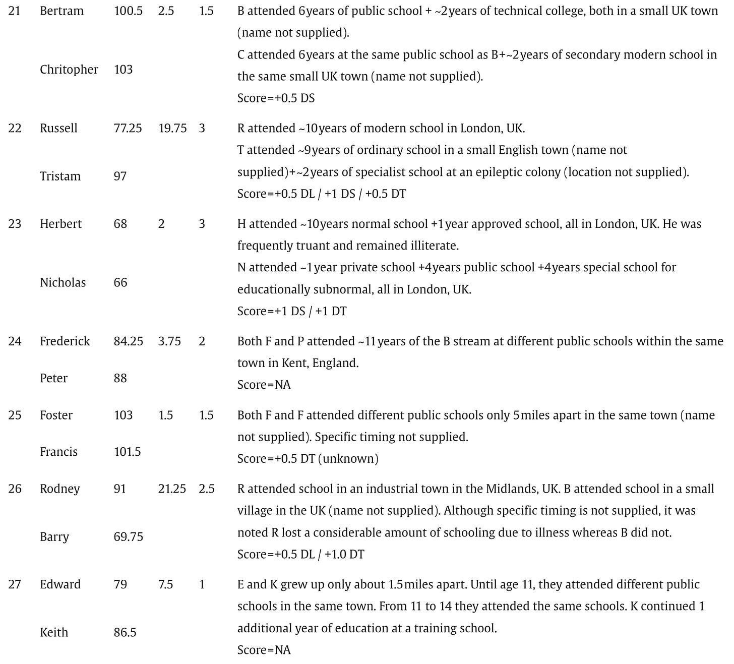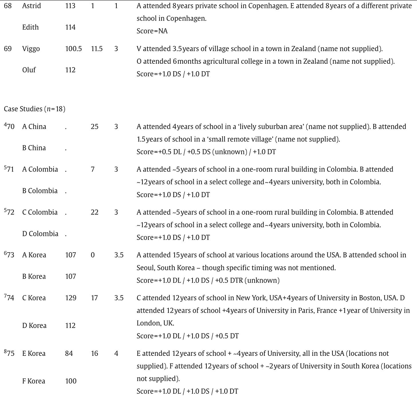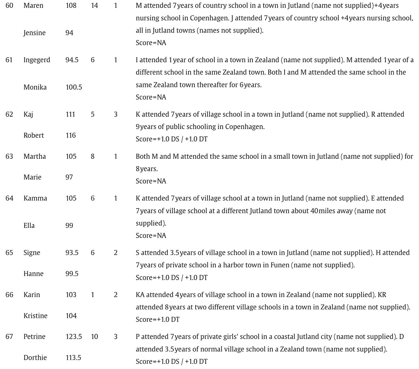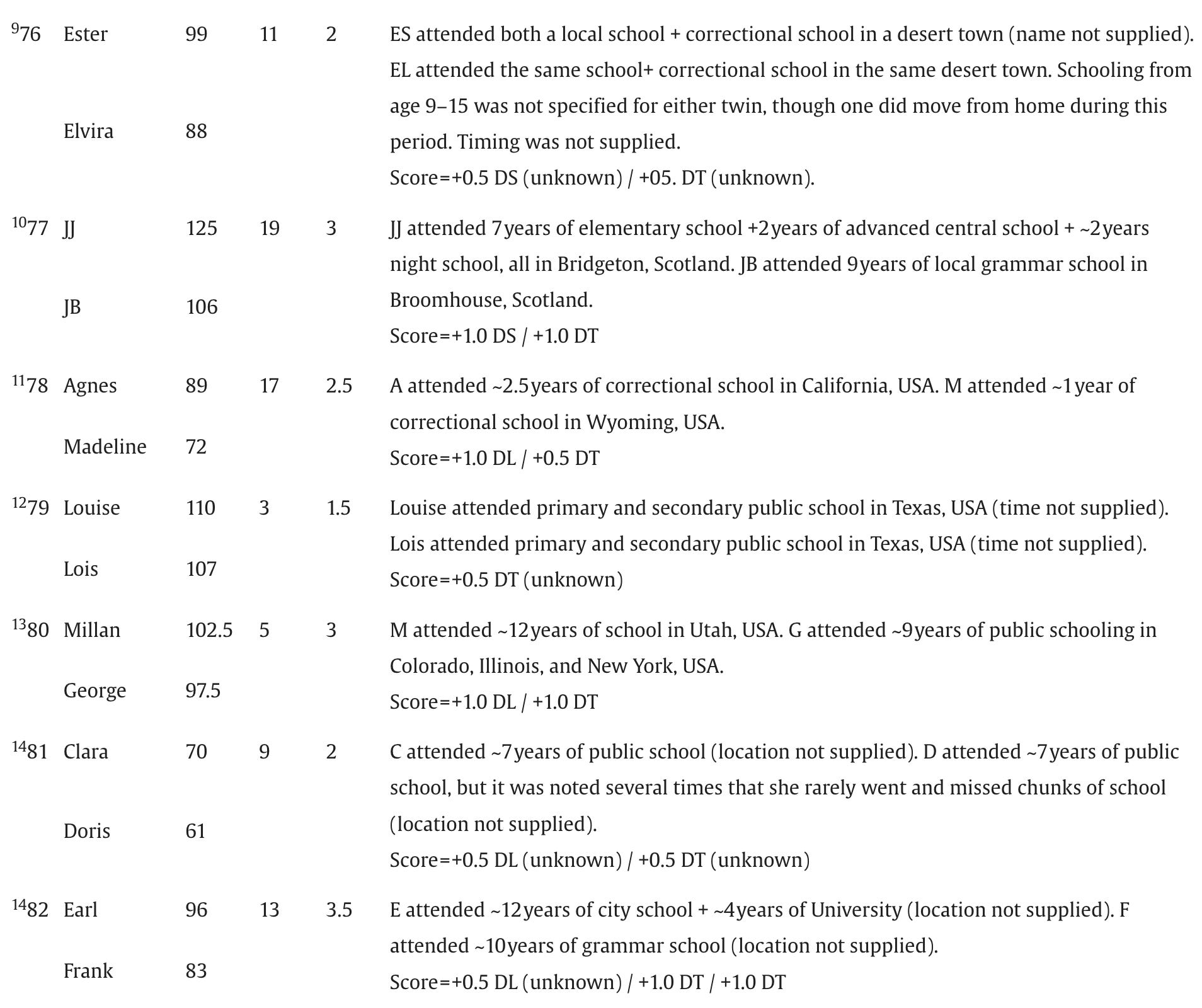Below are the screenshots of the summaries of IQs and schooling for the 87 pairs of identical twins raised apart that appear in Acta Psychologica, July 2025: