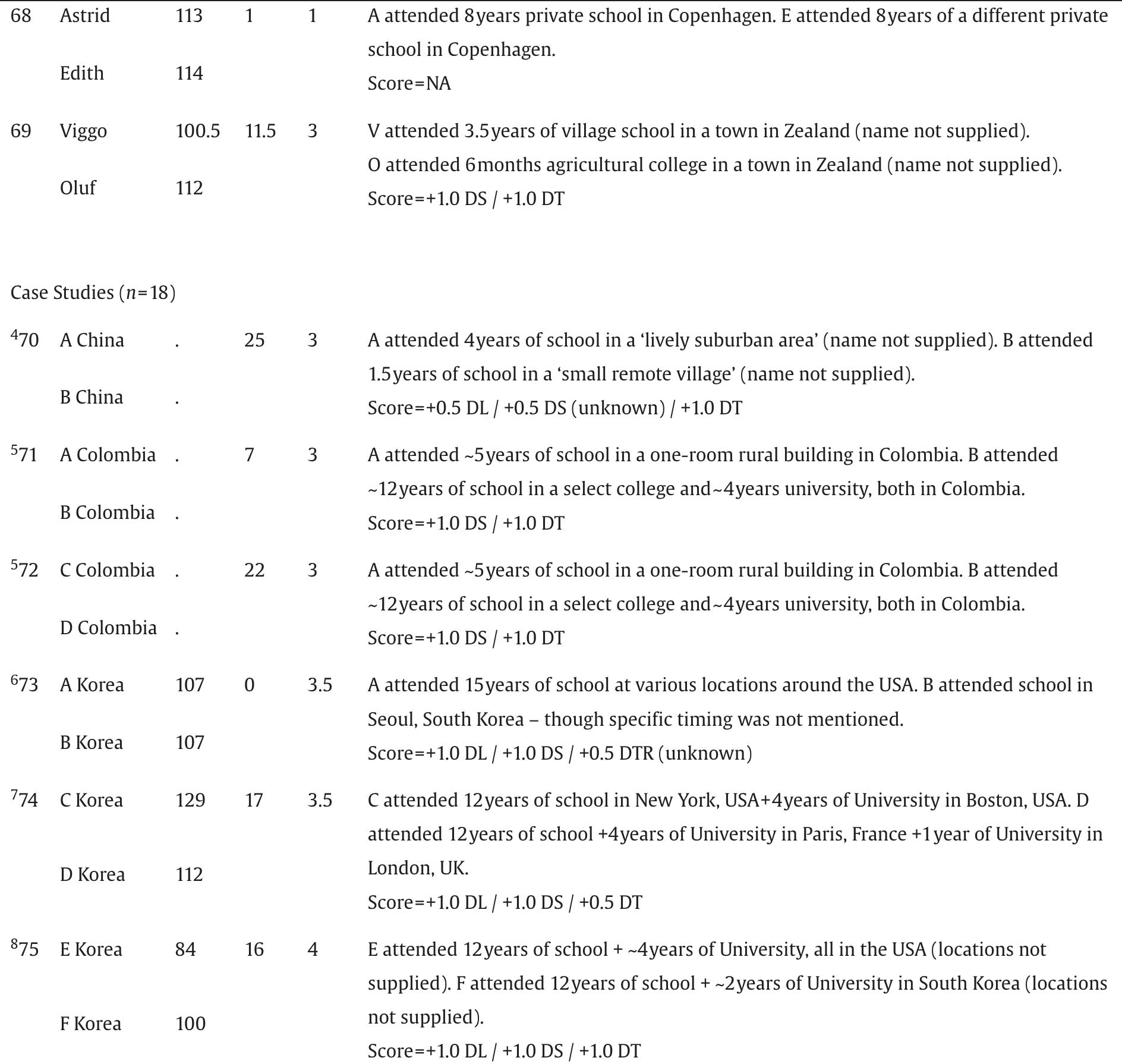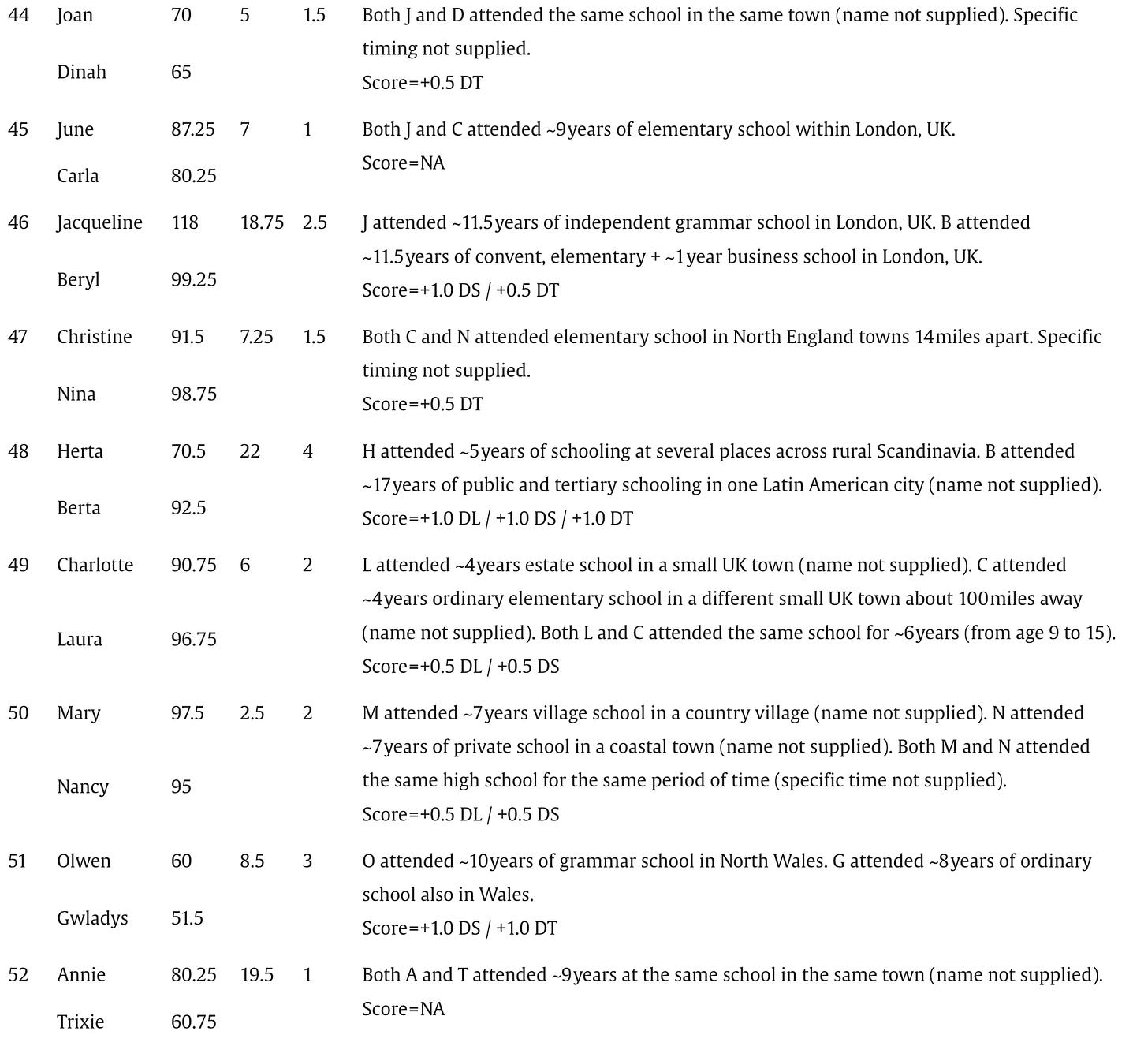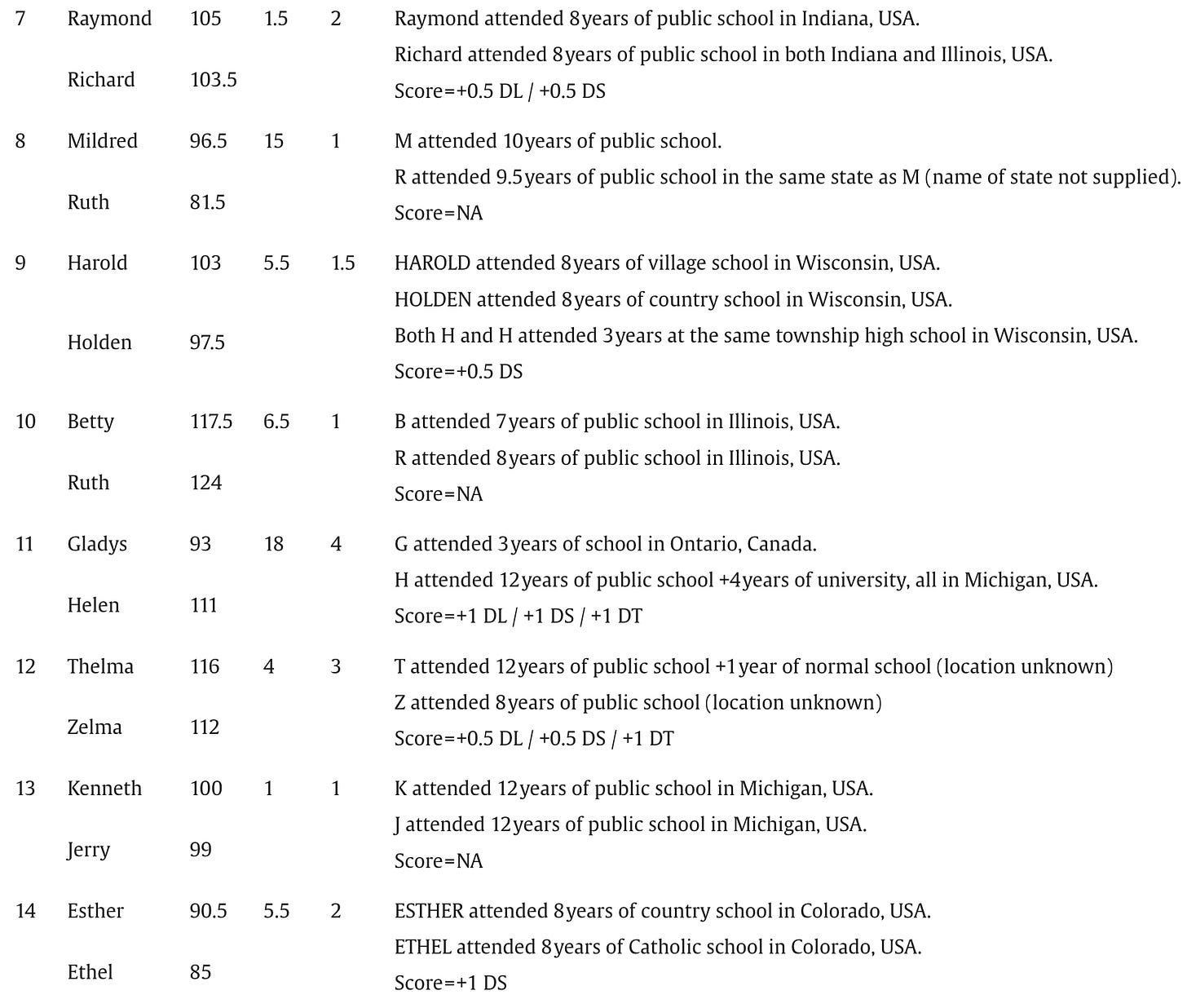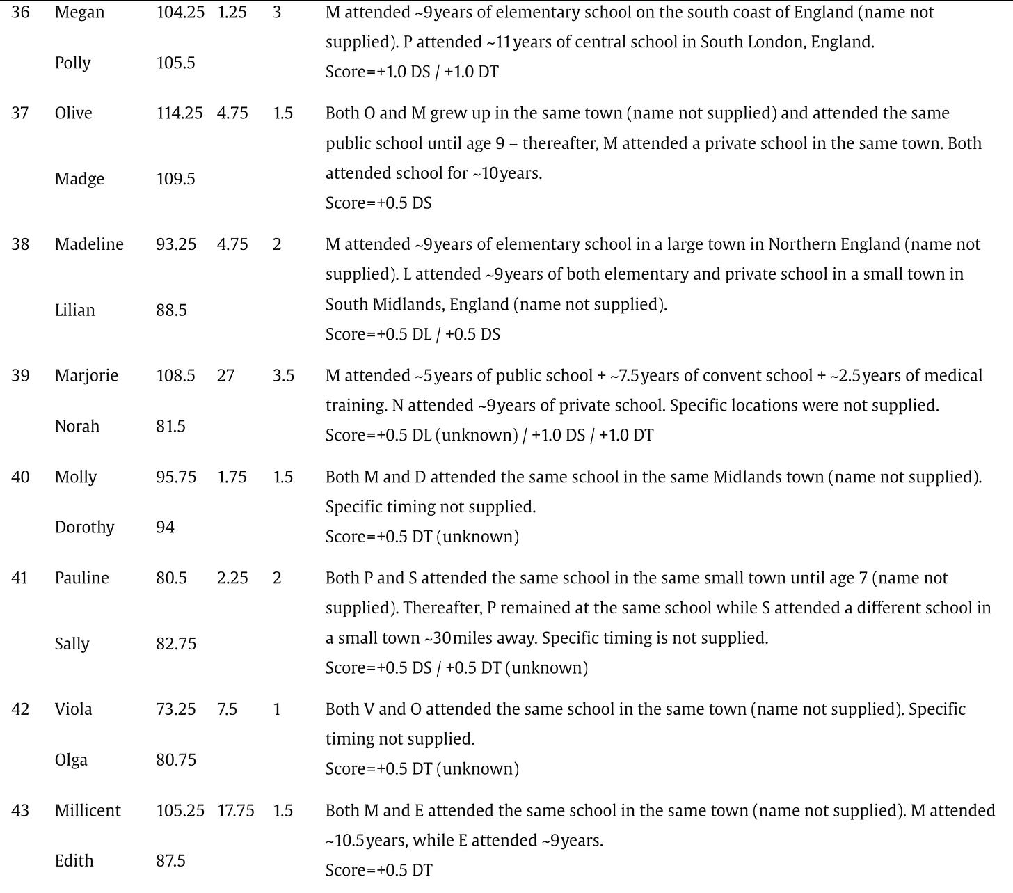Below are the screenshots of the summaries of IQs and schooling for the 87 pairs of identical twins raised apart that appear in Acta Psychologica, July 2025: