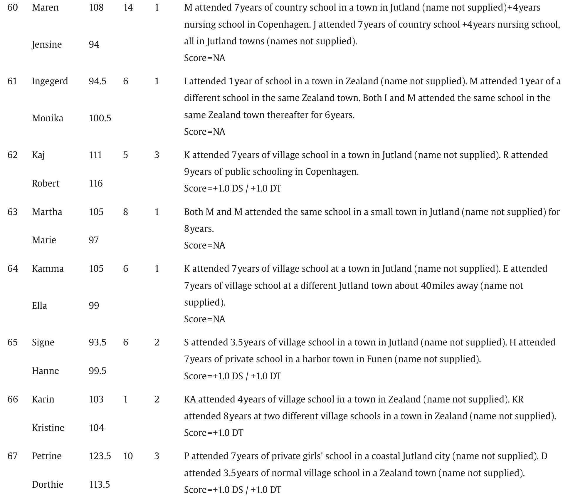 The capital city mixed pair each got 16 years of schooling and the the village mixed pair got only 5 years. It looks like one City Mouse outscored his Country Mouse twin by 22 points and the other by 7 for an average difference of 14.5 points.