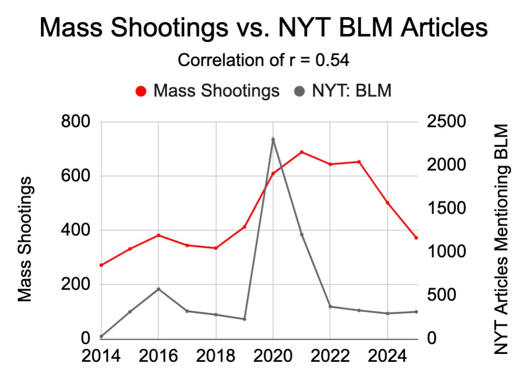 In 2020, the New York Times ran over six articles per day mentioning "Black Lives Matter." Mass shootings shot up. Coincidence?