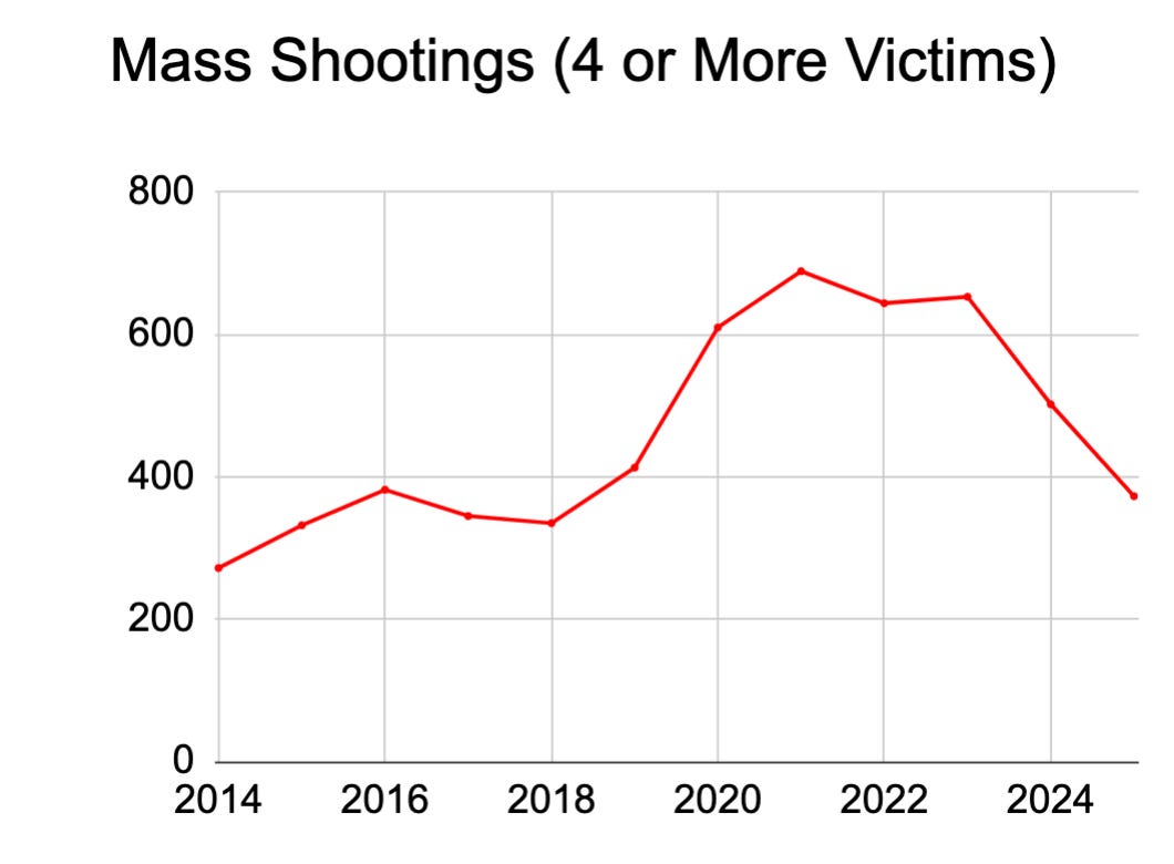 The Gun Violence Archive is a crowd-sourced website that tries to count all the shooting deaths in the country and all the mass shootings. It’s much faster than government sources such as FBI murder counts (which have a lag of over 8 months) and CDC homicide death counts (which are lagged by 6 months to let coroners have time to work — so we still don’t have CDC homicide totals for all of 2024 yet). The 2025 estimate is a projection that assumes the last 52% of 2025 will have the same rate as the first 48%.