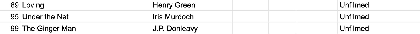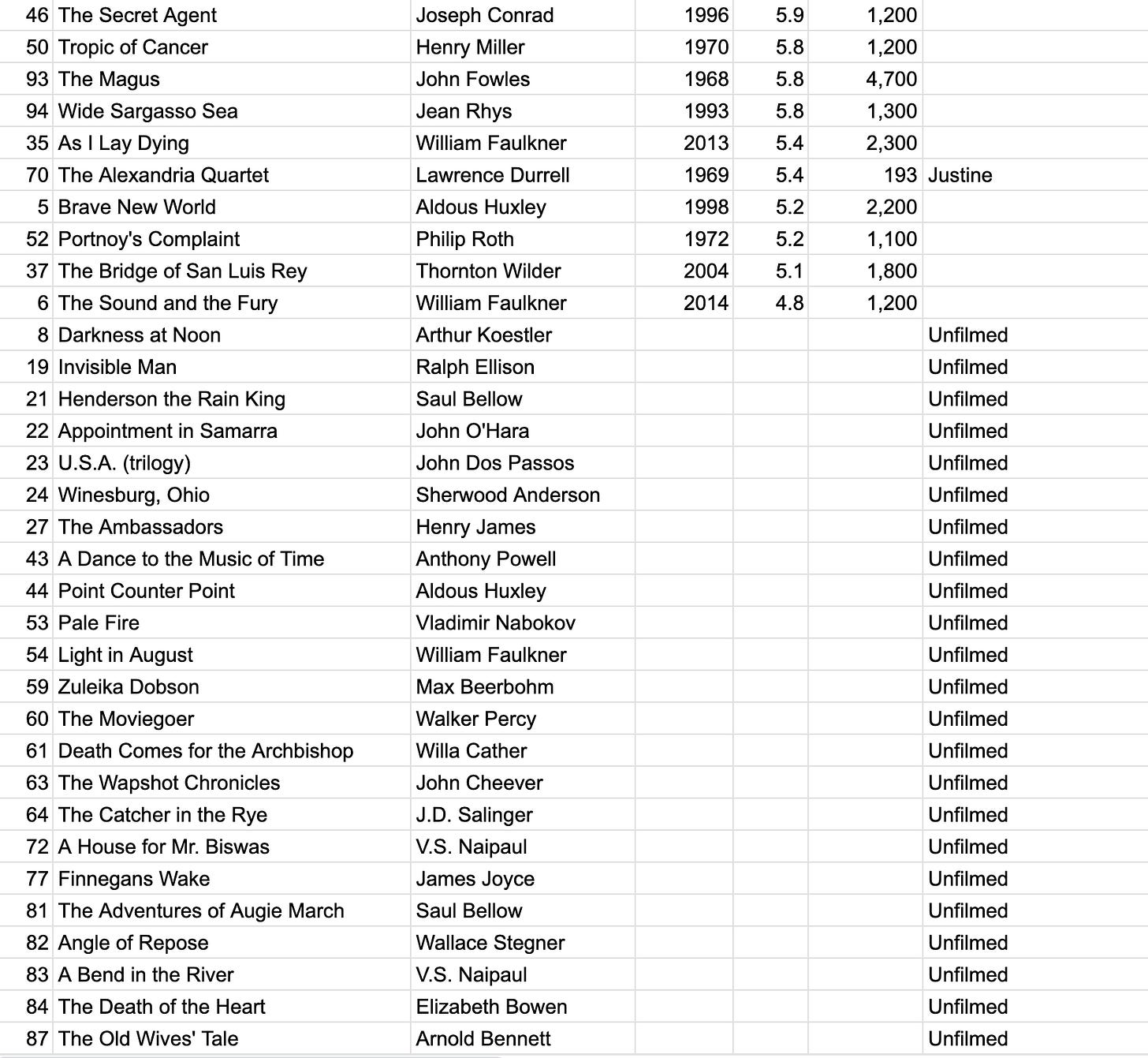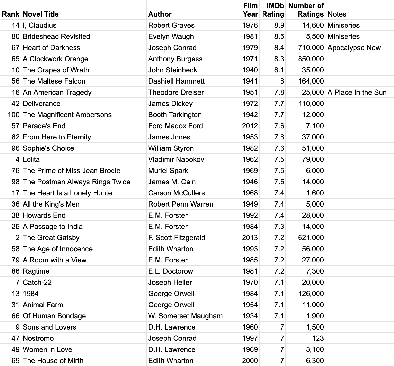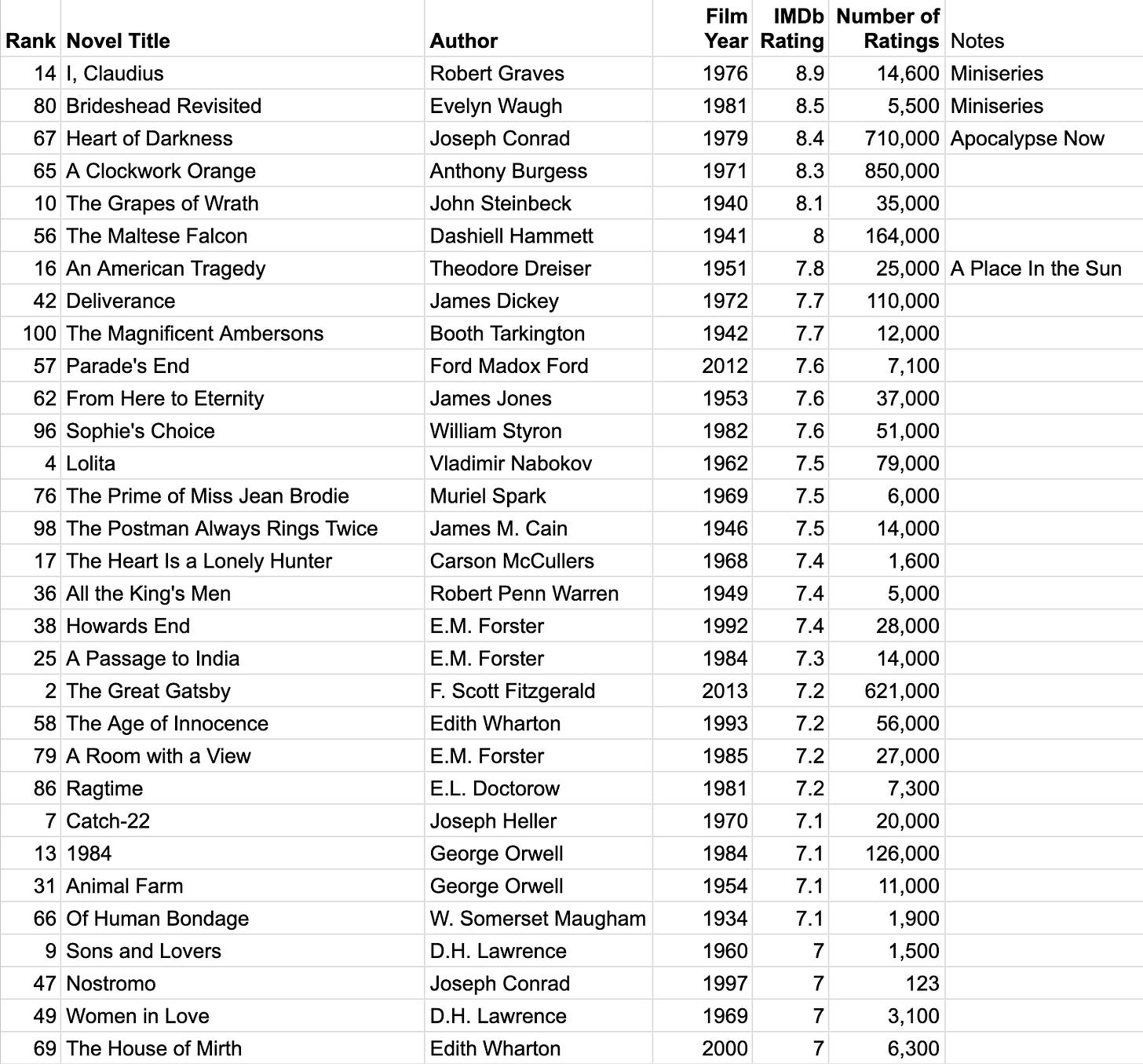 For some reason, Substack doesn’t make it easy to post tables (there are ways, but this old dog doesn’t learn many new tricks), so I’m going to post the top 100 novels list ranked by IMDB rating divided up into four screenshots: