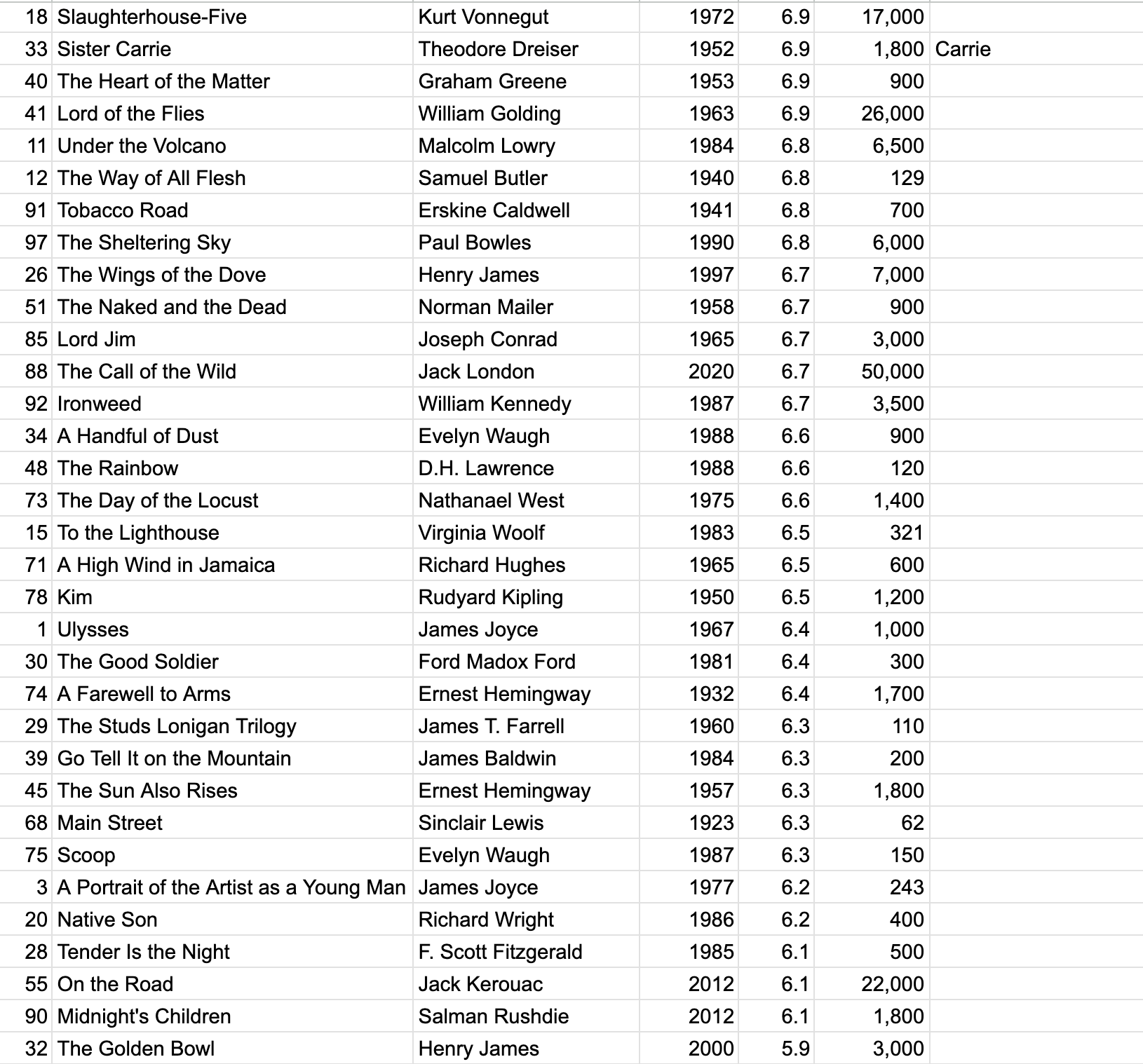 In contrast, this Modern Library ranking of top novels was not chosen with their movie adaptations in mind. There might well be some subconscious bias, but if there is, it’s not obvious in which direction it is, other than perhaps in picking a great novelist’s book to recognize, they tend to recognize one that made a great movie.