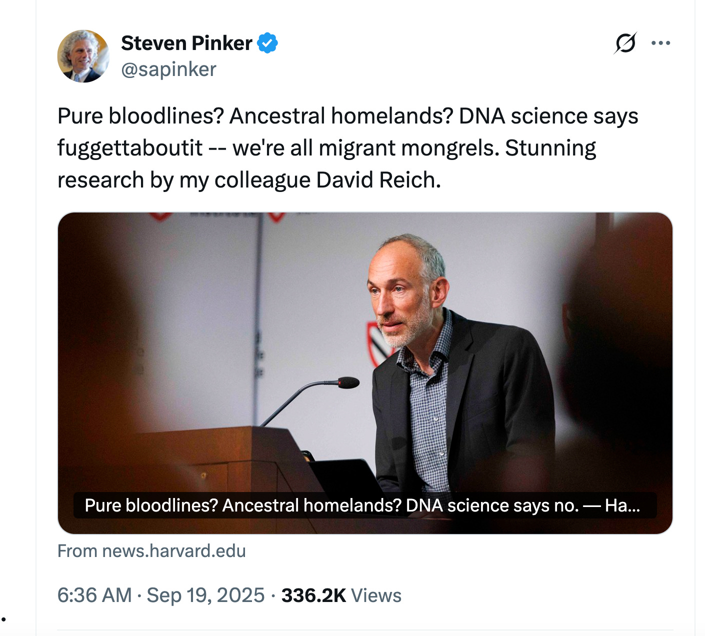 Here’s a piece from the Harvard PR department about a recent talk given by superstar ancient geneticist David Reich. (That sounds derogatory, but I’m actually a fan of university PR departments. They employ bright verbalists to explain what their professors’ research finds.) It tends to start off comforting current liberal conventional wisdom, but then gets more subversive as it goes along.