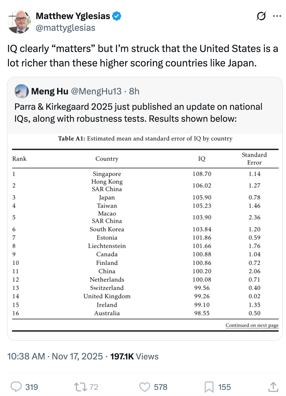 Pinker: Irony: Replicability crisis in psych DOESN’T apply to IQ: huge n’s, replicable results. But people hate the message..