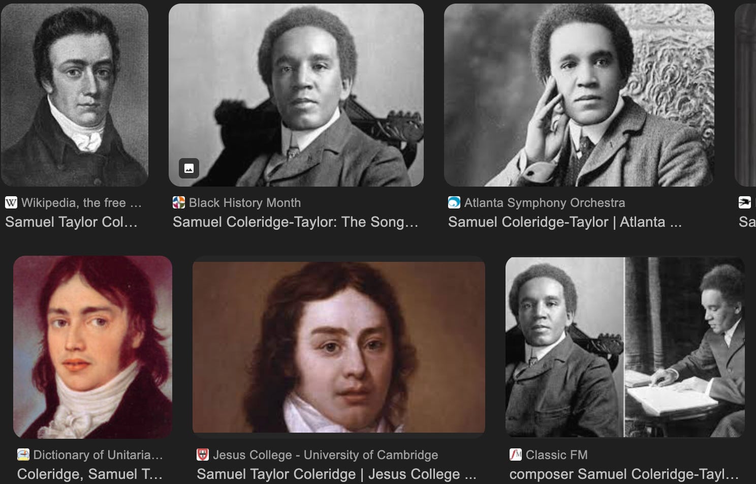 In case you are wondering, half-black British composer Samuel Coleridge-Taylor (1875-1912) was not British poet Samuel Taylor Coleridge (1772-1834), author of Xanadu and Rime of the Ancient Mariner.