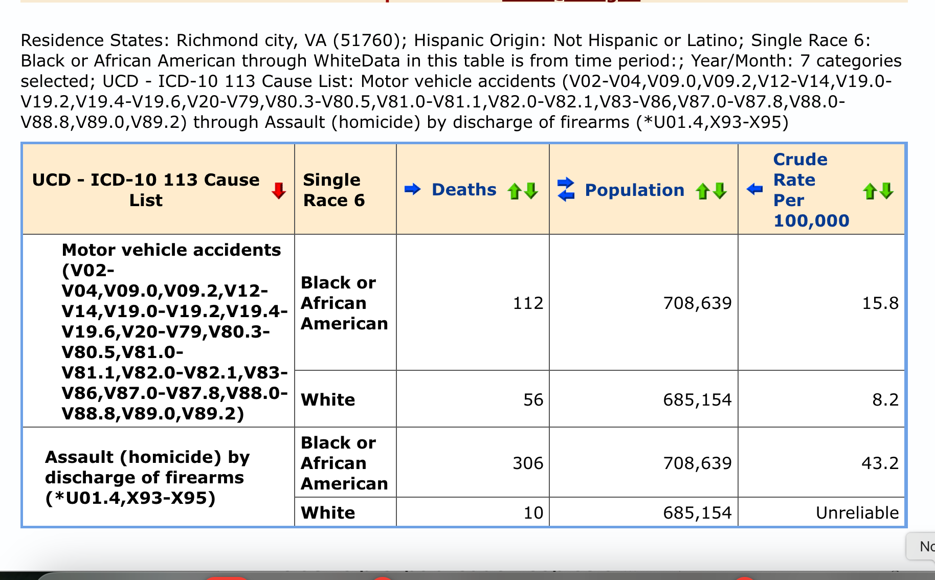 According to the CDC WONDER database, blacks in Richmond, Virginia died 93% more per capita in motor vehicle accidents in 2018 through 2024 than did whites in Richmond.