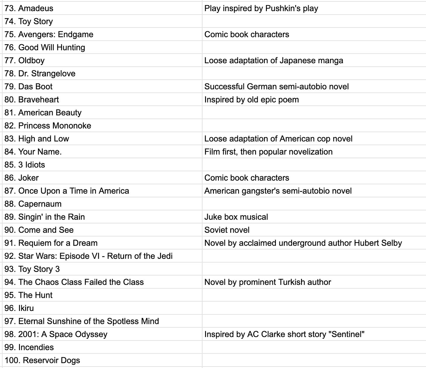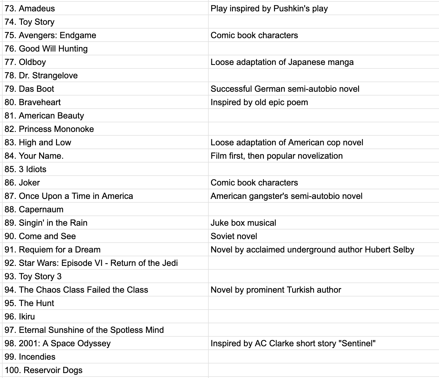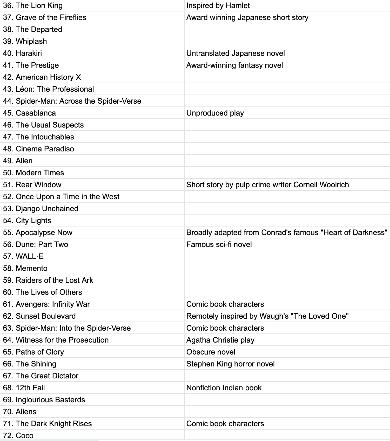 52 of the 100 don’t appear to have sources outside the film industry. (And that’s generously calling The Lion King “inspired by Hamlet.”)