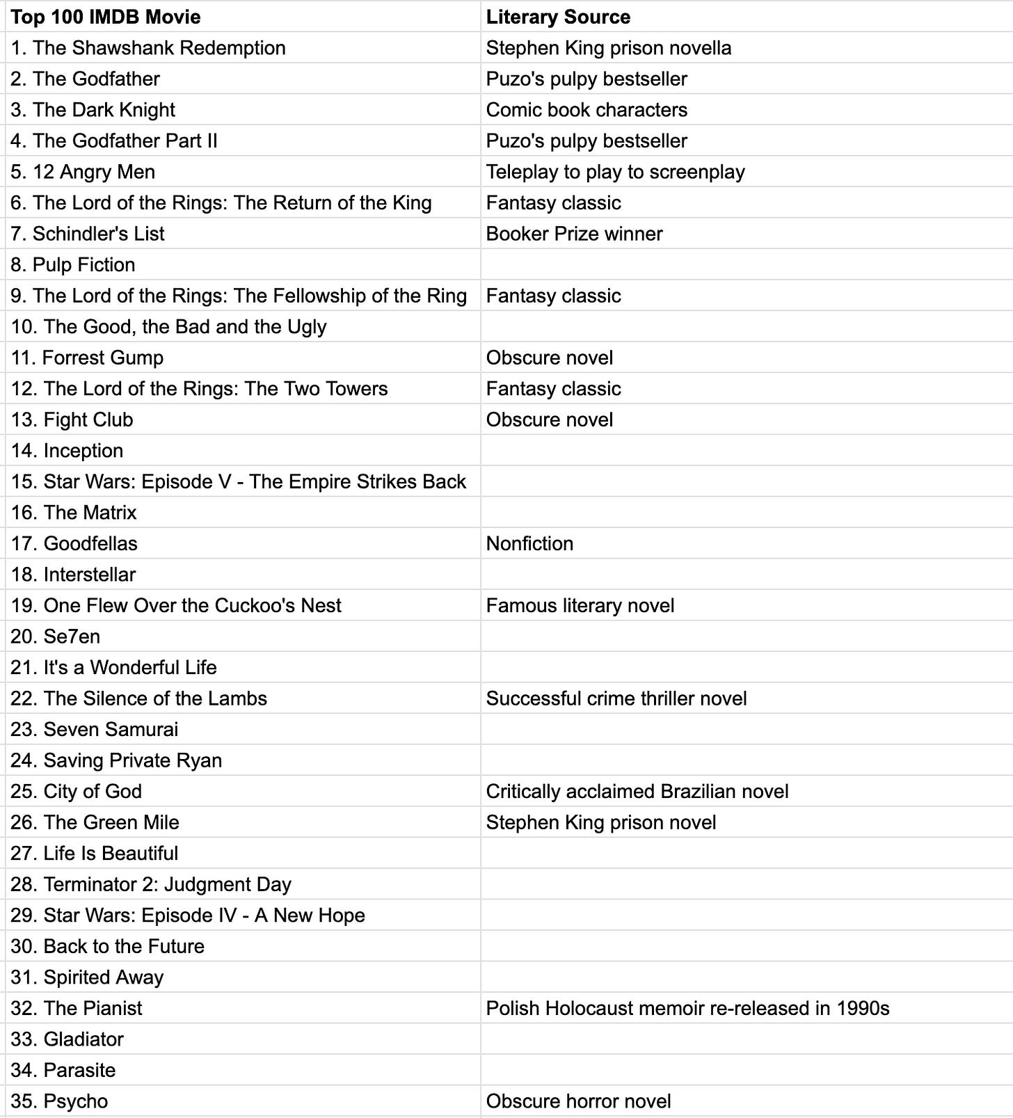Here’s IMDB’s top 100 and their printed sources, if any. If I leave blank the source, that means the story and screenplay were all made up by film industry professionals for this film. E.g., Pulp Fiction never appeared on pulp. Instead, it’s an original screenplay by Quentin Tarantino and Roger Avary.
