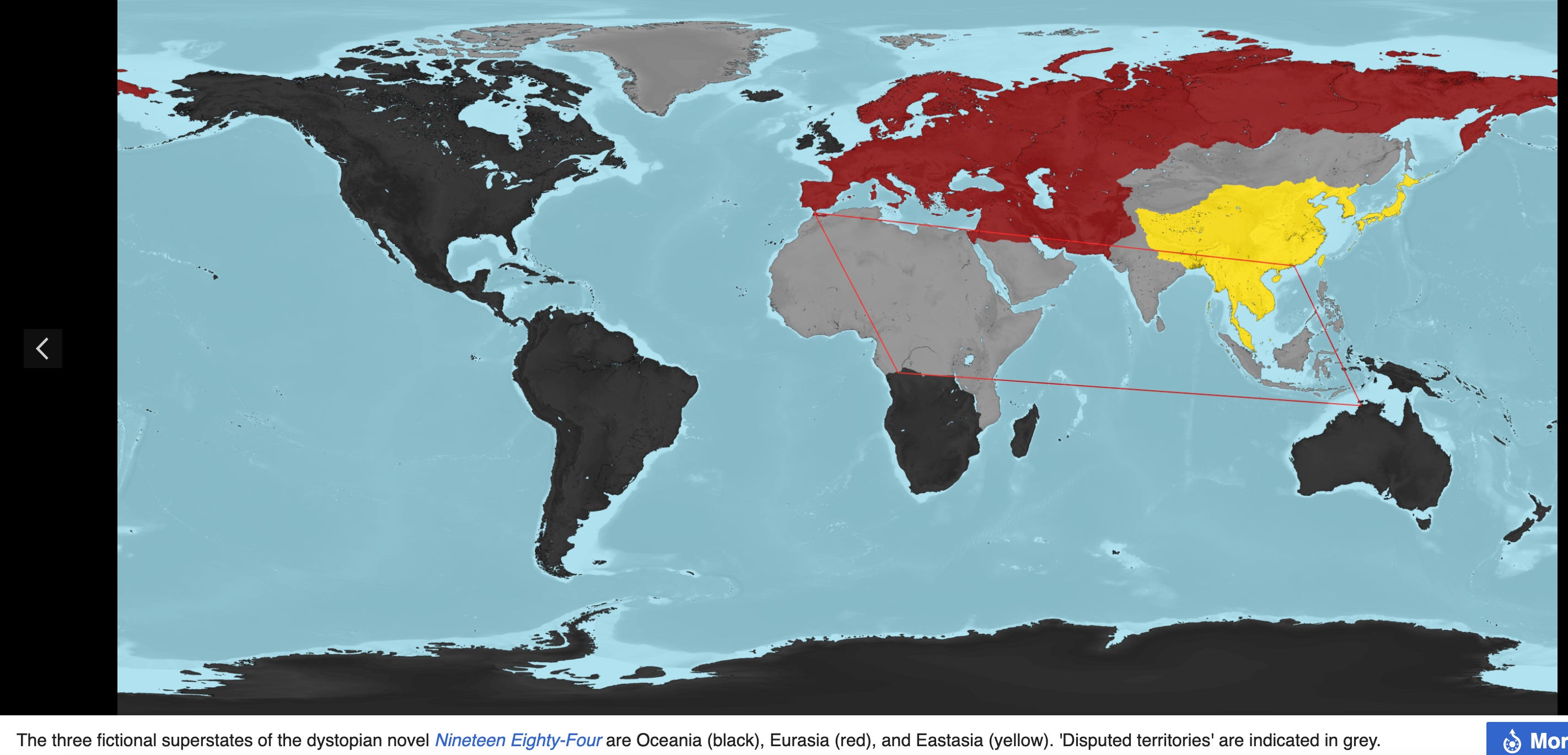 The splitting-up of the world into three great superstates was an event which could be and indeed was foreseen before the middle of the twentieth century. With the absorption of Europe by Russia and of the British Empire by the United States, two of the three existing powers, Eurasia and Oceania, were already effectively in being. The third, Eastasia, only emerged as a distinct unit after another decade of confused fighting. The frontiers between the three superstates are in some places arbitrary, and in others they fluctuate according to the fortunes of war, but in general they follow geographical lines. Eurasia comprises the whole of the northern part of the European and Asiatic land-mass, from Portugal to the Bering Strait. Oceania comprises the Americas, the Atlantic islands including the British Isles, Australasia, and the southern portion of Africa. Eastasia, smaller than the others and with a less definite western frontier, comprises China and the countries to the south of it, the Japanese islands and a large but fluctuating portion of Manchuria, Mongolia, and Tibet.