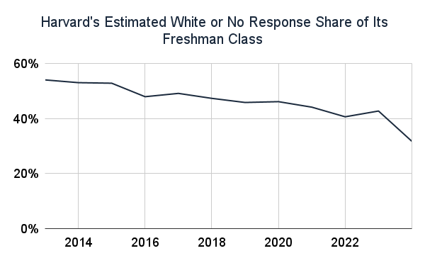 The Crimson tries to back out the white share by subtracting everybody else’s shares from 100%, but that only gives it what it calls “White/Other.” Does that include No Responses (which went up from 4% last year to 8% this year)? That’s vague. (And how many freshmen checked more than one race box? Presumably, non-citizen International freshmen aren’t being counted in either the numerator or the denominator.)