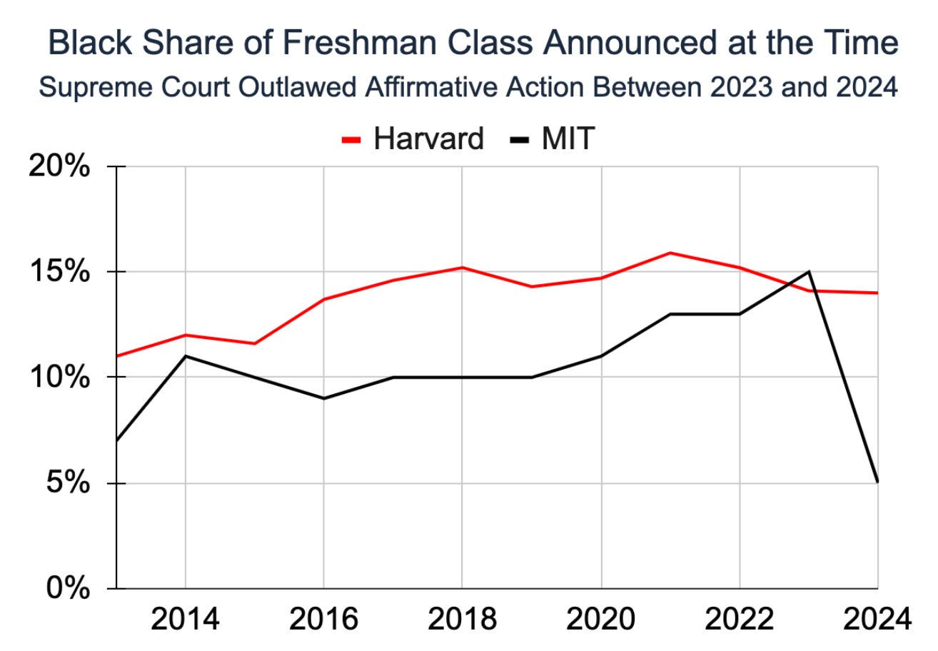 In contrast to Harvard, way back on August 22, MIT fairly forthrightly led off this year’s Class of 2028 announcements by saying that its freshman class had dropped from 15% black to 5% black due to the Law of the Land.