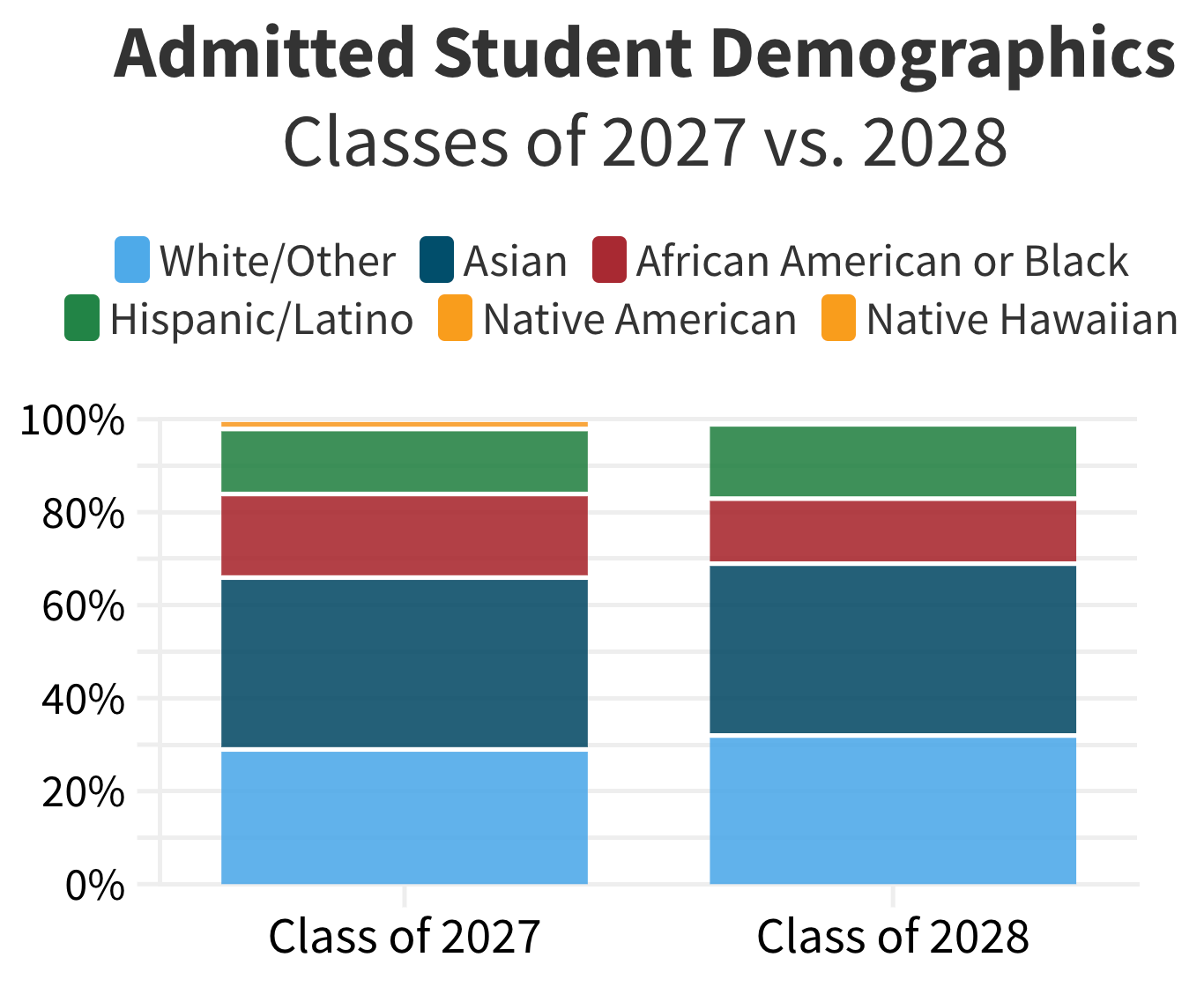 In the Class of 2028, 8 percent of students chose to not disclose their race or ethnicity, whereas only 4 percent of students in the Class of 2027 chose to not report their demographic information.