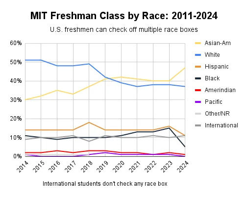 So it’s possible that MIT cleverly let in some extra blacks in recent year in anticipation of Harvard losing in the Supreme Court, so that it could look in 2024 like it was taking the law very seriously by cutting blacks by two-thirds instead of more like by half versus its long-term race quota.