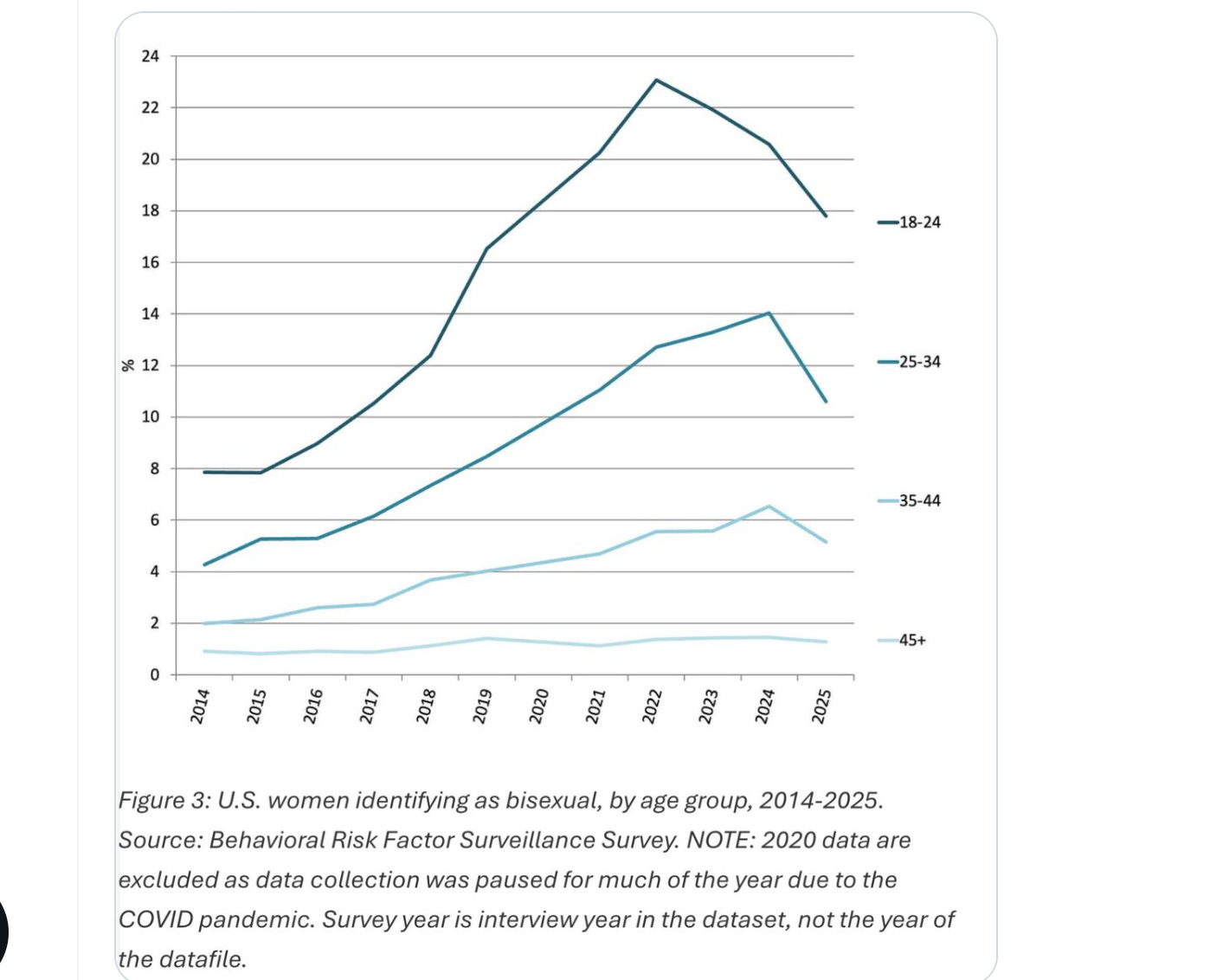 Social scientist Jean Twenge, whose book Generations I reviewed in Taki’s Magazine in 2023, points out that in the latest big federal survey, the percentage of young women age 18 to 24 claiming to be bisexual has continued to drop after almost tripling from 8% in 2014-15 to a peak of 23% in 2022.