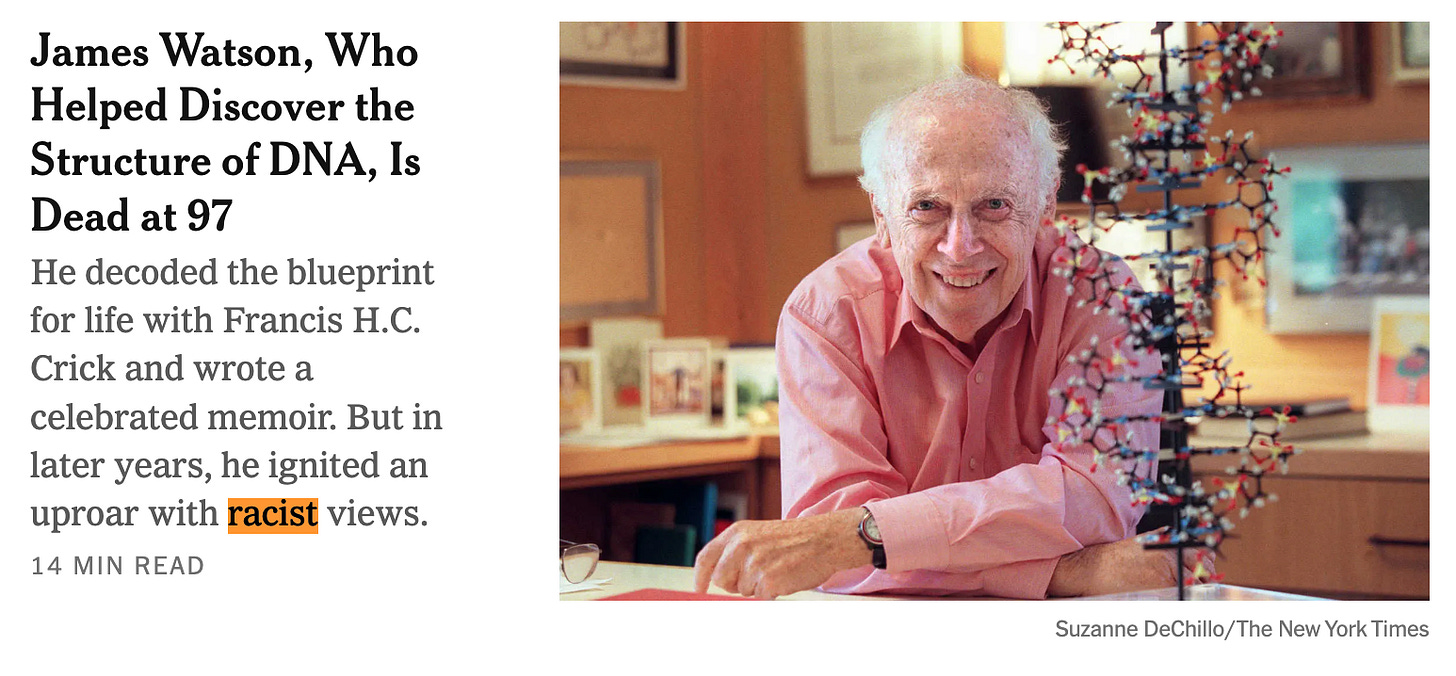 Along with the 2005 cancellation of Harvard president Larry Summers for telling the truth about male and female cognitive differences, the 2007 cancellation of James D. Watson, America’s most distinguished man of science, for telling the truth about racial cognitive differences was a catastrophic milestone in America’s descent into the anti-science hysteria of the Great Awokening decade (hopefully, now in our rear view mirror).