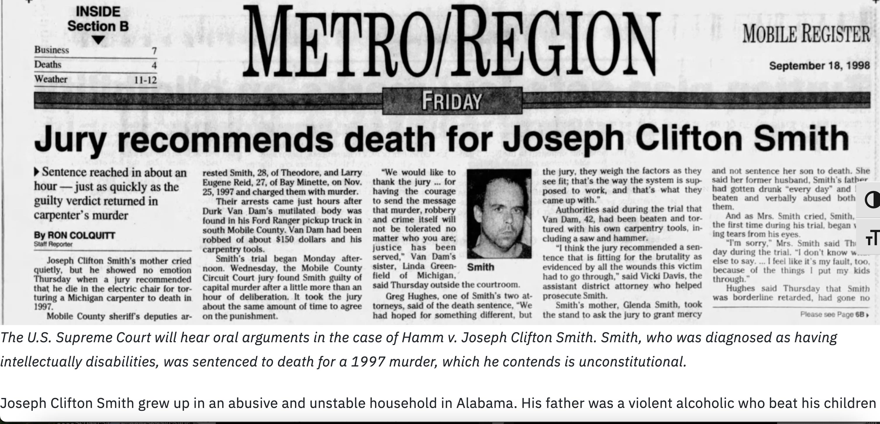 A lower court ruled that Joseph Clifton Smith is intellectually disabled based on its analysis of his IQ test scores and expert testimony. Under a 2002 Supreme Court precedent, executing an intellectually disabled person violates the U.S. Constitution’s Eighth Amendment bar on cruel and unusual punishment. …