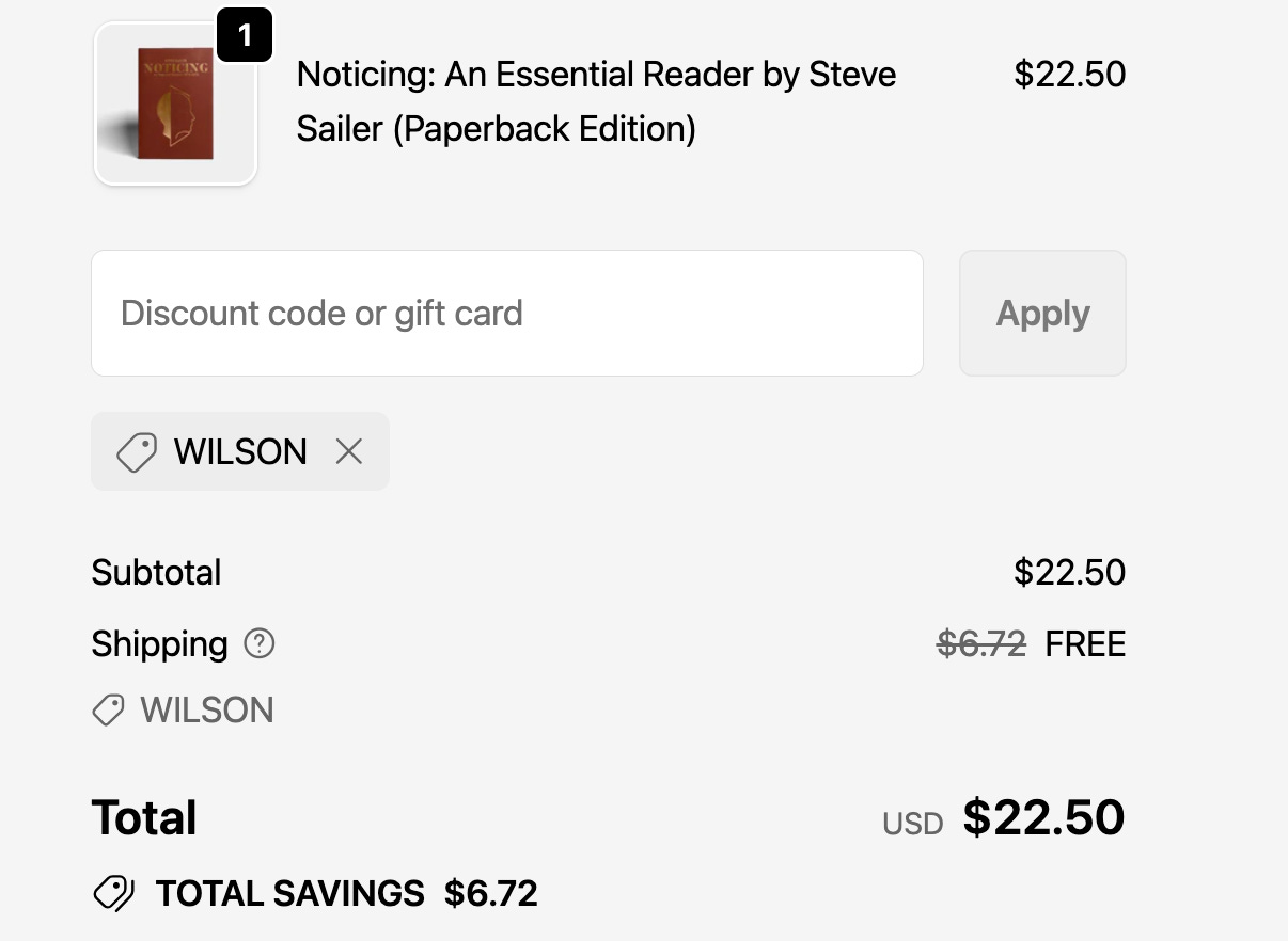 Between the free shipping and the discount off the list price, you will save 39% versus buying Noticing from Passage during most weeks of the year. So, why not buy one copy for yourself and one as a gift?