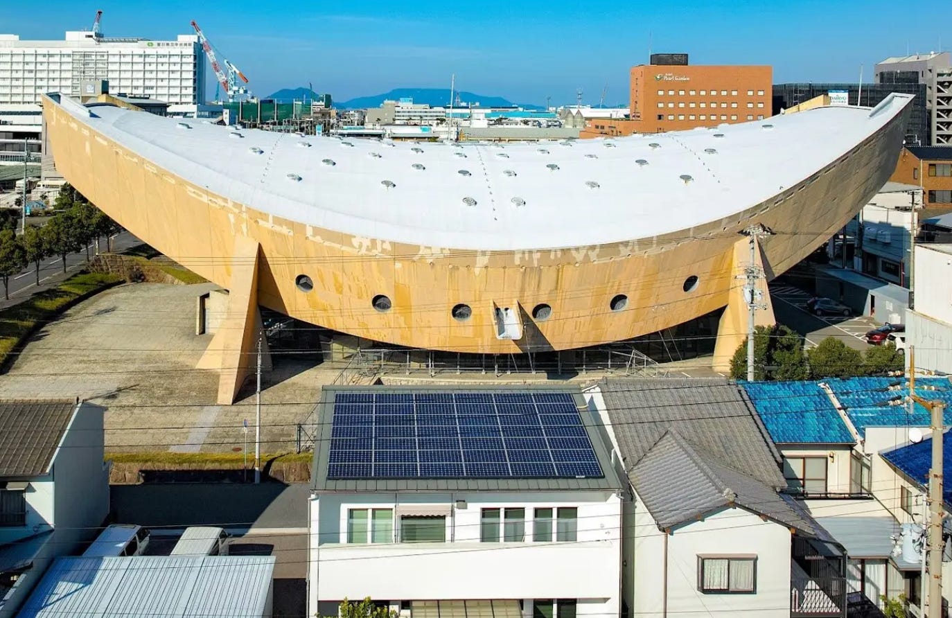 Looking like Noah’s ark just before the Flood, the Kagawa Prefectural Gymnasium, with seating for 2,500 spectators, was designed by architect Kenzo Tange and opened in 1964 in earthquake-prone Japan.