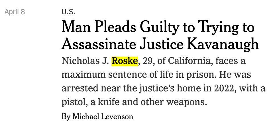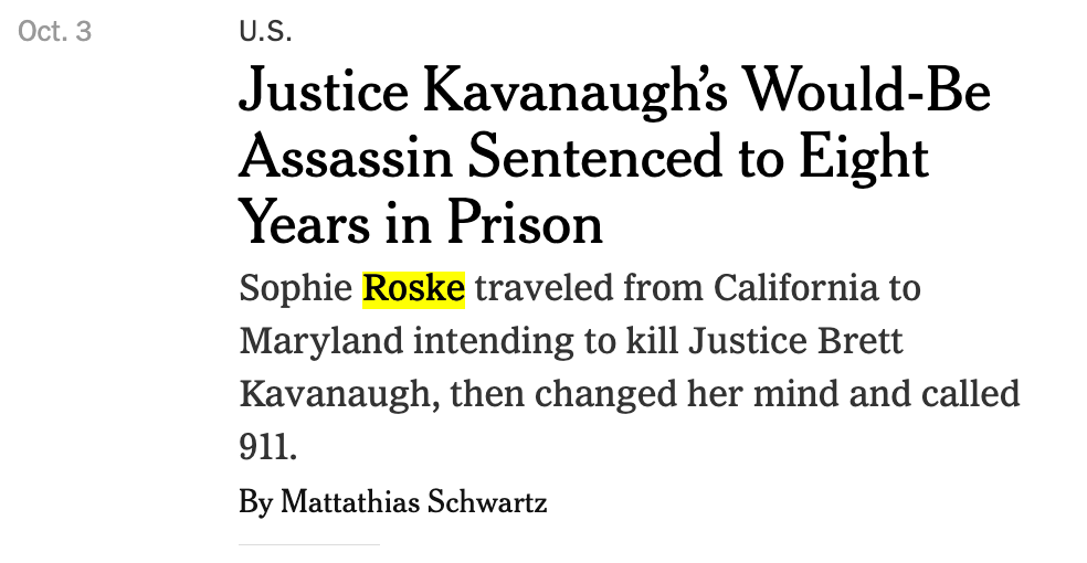Here are the two most recent New York Times mentions of the would-be assassin of Supreme Court Justice Brett Kavanaugh: