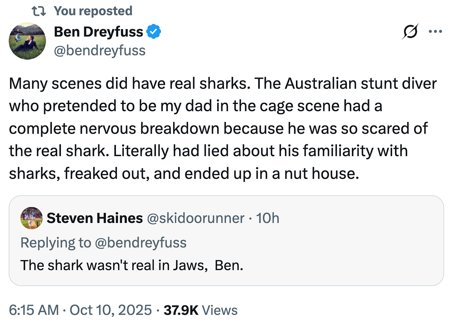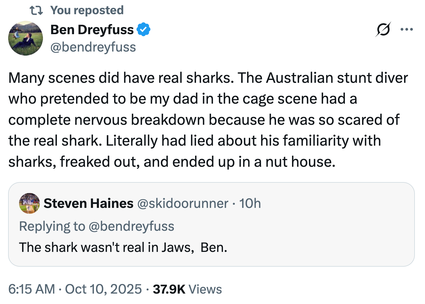 Ben Dreyfuss, son of Richard Dreyfuss, tells a story about the making of Jaws: