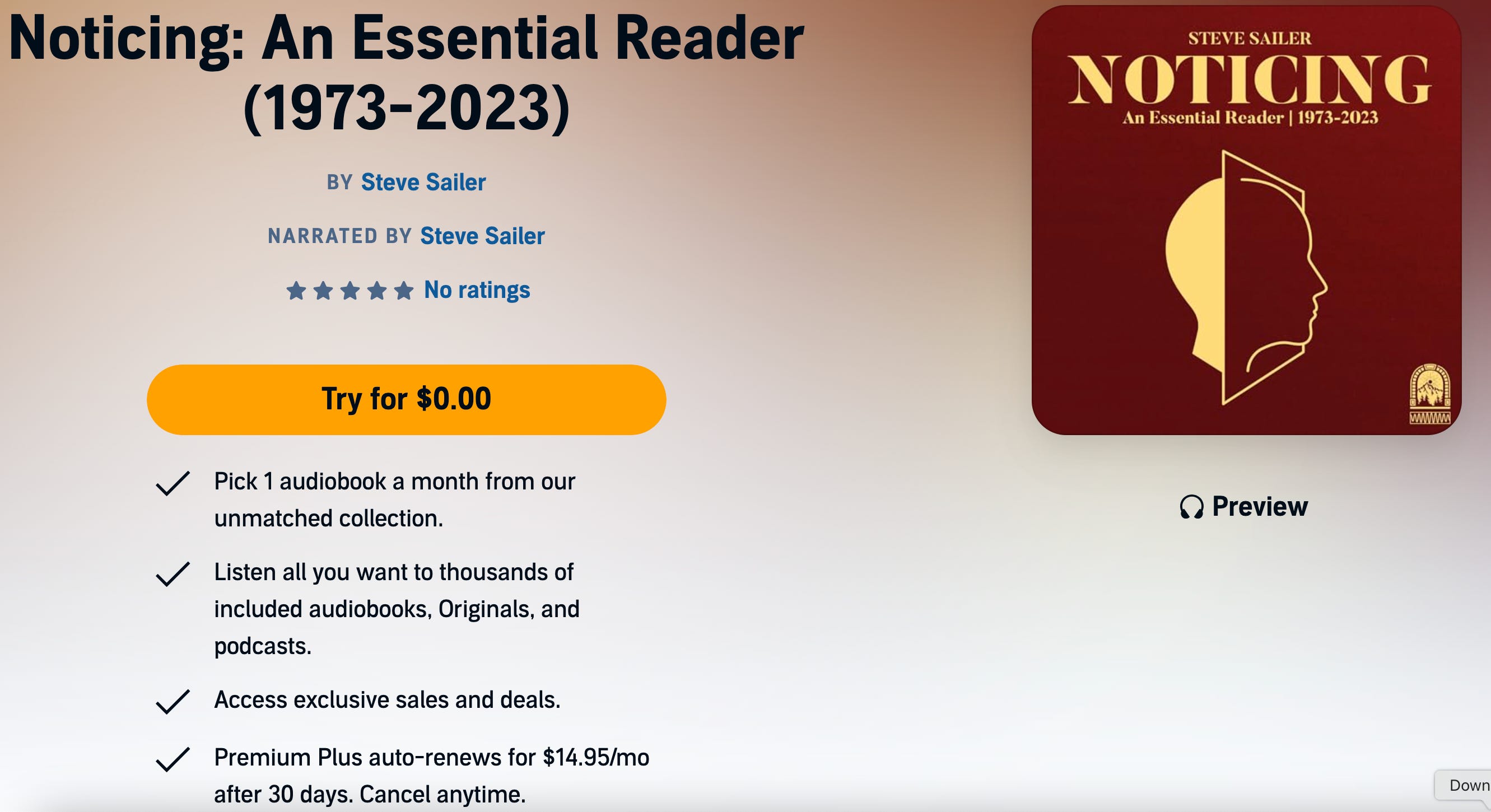Narrated by me, "Noticing" is available on Amazon's Audible service.