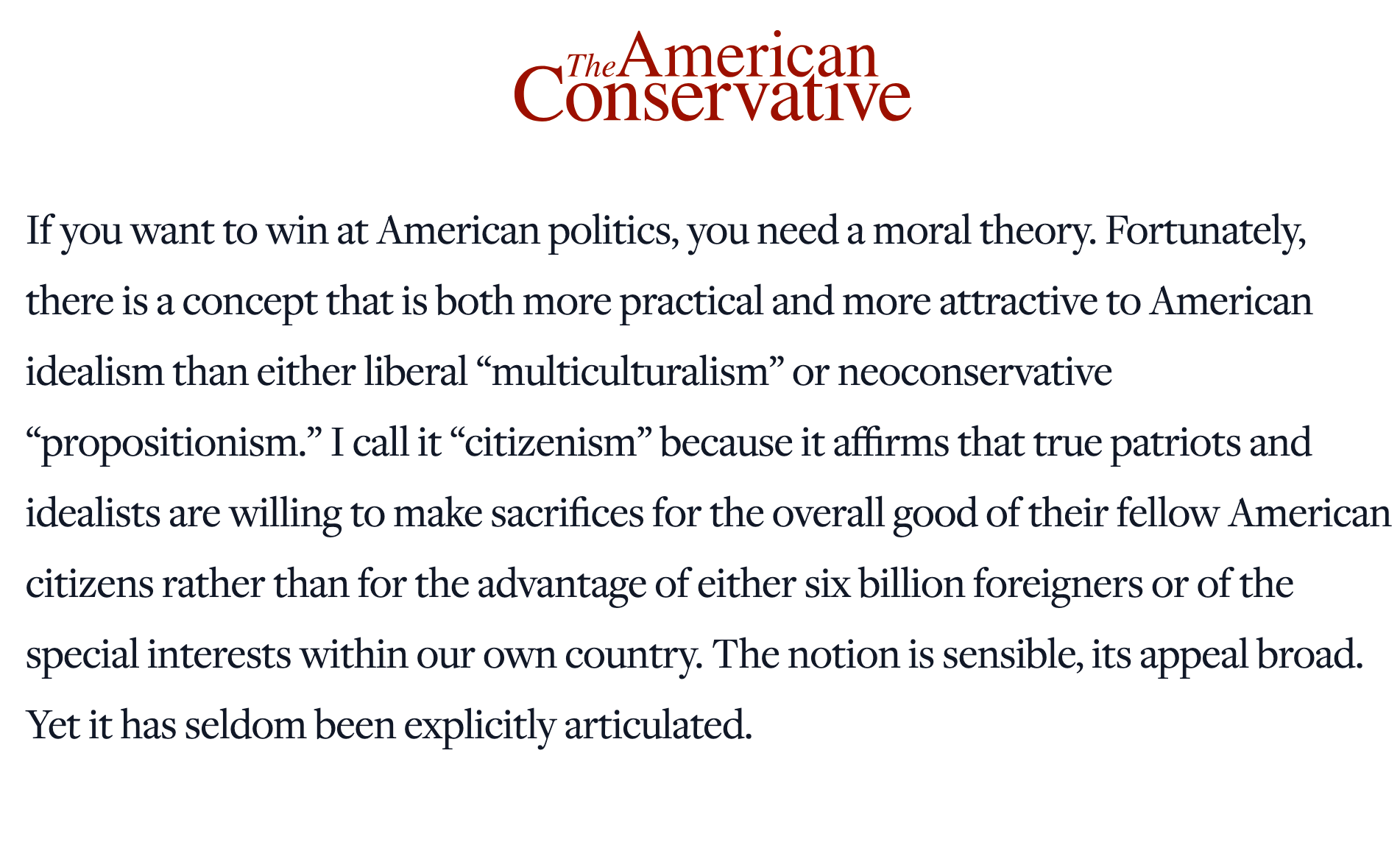 If you want to win at American politics, you need a moral theory. Fortunately, there is a concept that is both more practical and more attractive to American idealism than either liberal “multiculturalism” or neoconservative “propositionism.” I call it “citizenism” because it affirms that true patriots and idealists are willing to make sacrifices for the overall good of their fellow American citizens rather than for the advantage of either six billion foreigners or of the special interests within our own country. The notion is sensible, its appeal broad. Yet it has seldom been explicitly articulated.