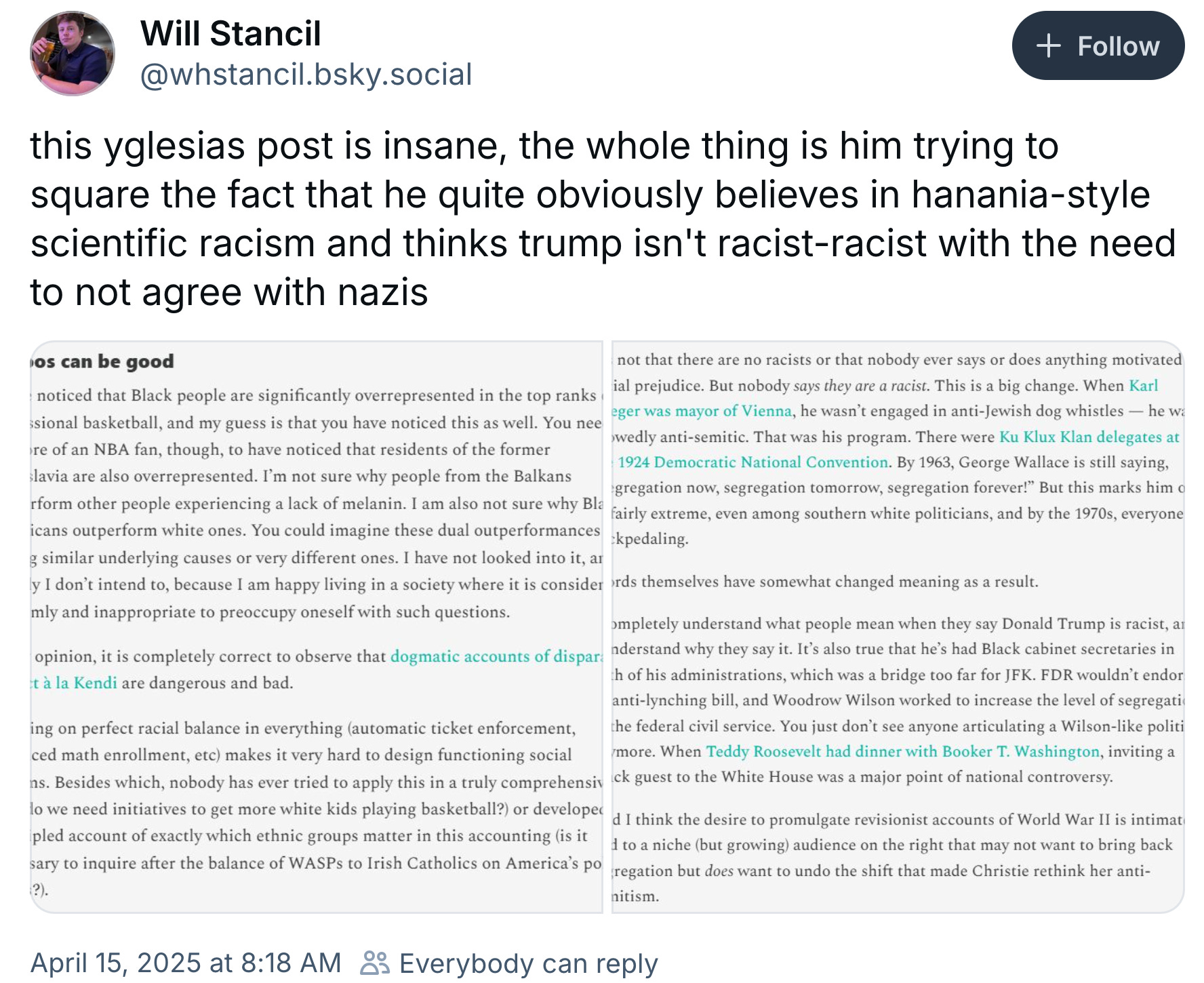Meanwhile, over at BlueSky: Will Stancil is accusing NBA fan Matthew Yglesias of being a Richard Hanania-style scientific racist. You see, Yglesias not only believes that blacks tend to be better than average basketball players, but Yglesias also is aware of the fact that Balkans tend to be long on basketball talent as well!