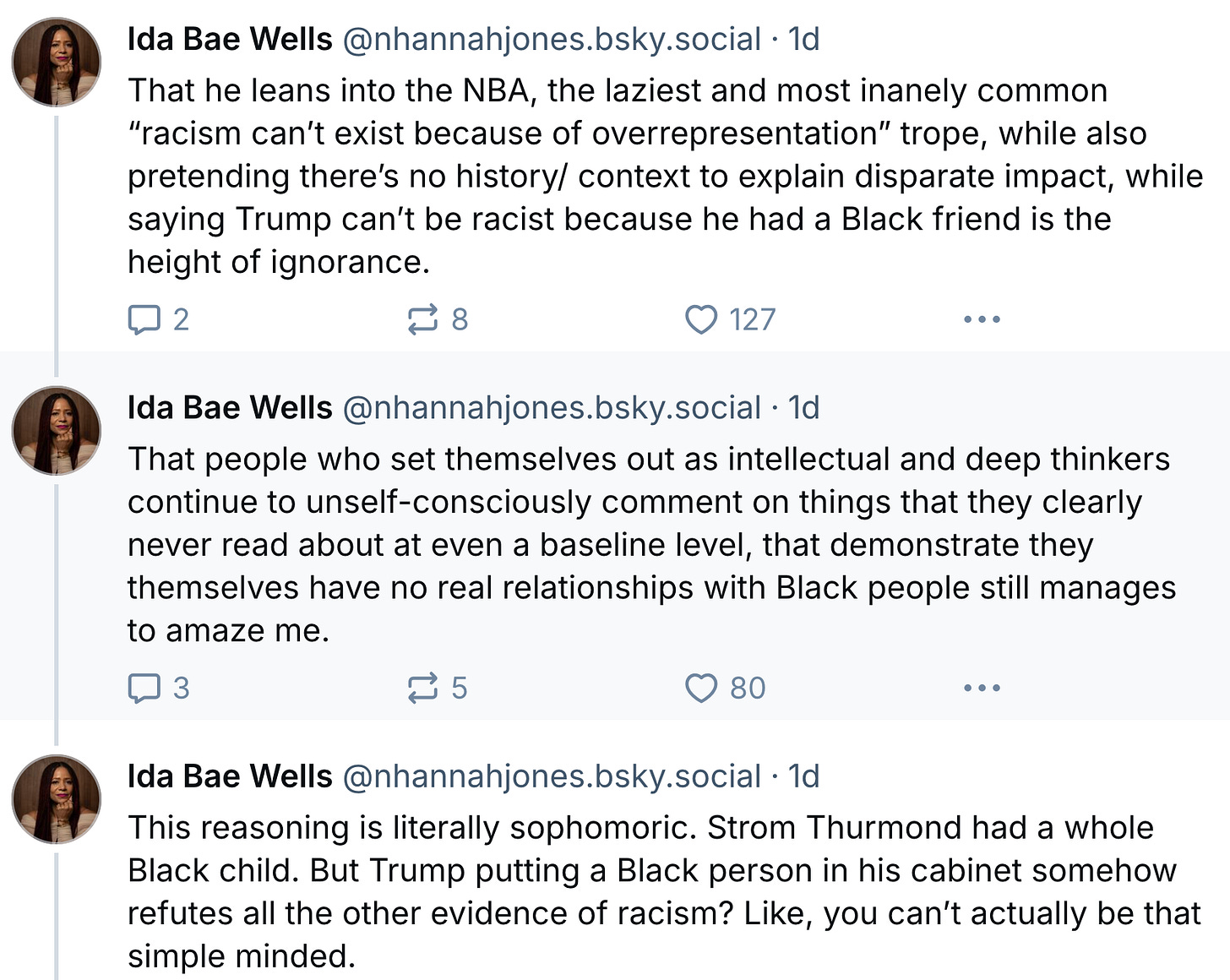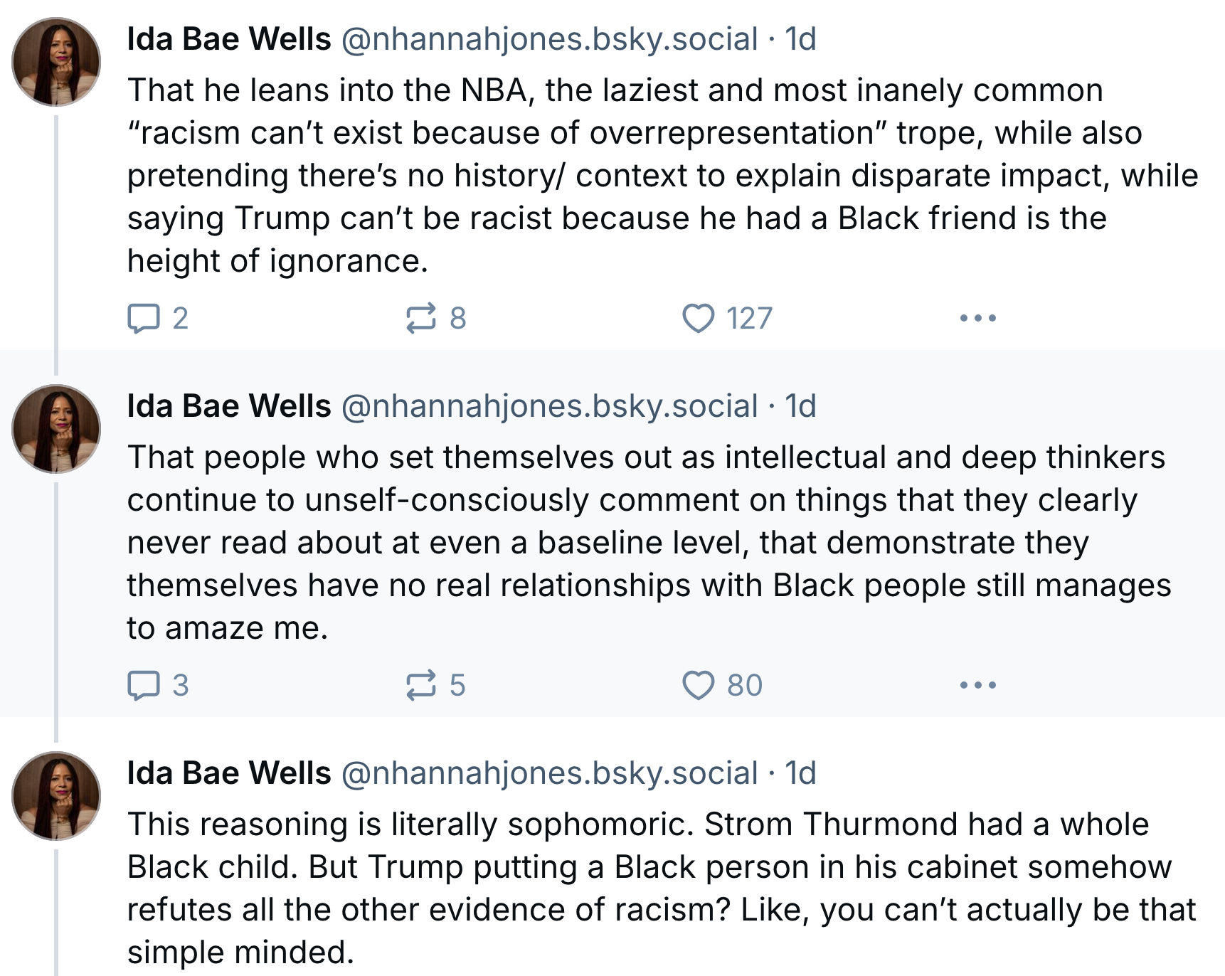 Dear Will (future Will, not me today haha): I'm really making a good impression on Bluesky and I'm making lots of friends! You'll never guess who replied to my post today! I'll give you a hint: New York Times... Yes, THAT New York Times. Another hint: 1619 Project.... Yes, THAT 1619 Project. Give up? It was Nikole. Hannah. Jones!!!! She replied to me!!!! Watch out world, Will's going places now! Anyhow, talk to you tomorrow. Who knows who will reply to me next!