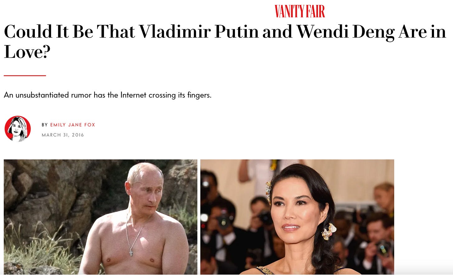 The Putin rumor seems more like wishful thinking on the part of gossip fans for a fitting can-you-top-this climax to Wendi’s odyssey. Vanity Fair snarked in 2016:
