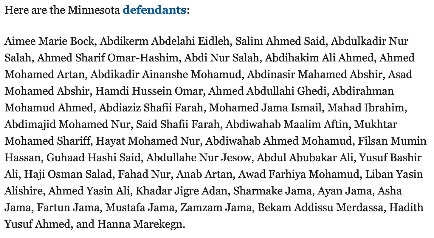 Minnesota Somalis prefer to minimize the number of non-Somalis allowed in on the action. This is seen, for instance, in the defendants in the 2022 case United States v. Aimee Marie Bock, et al. in which one white lady inspector and 43 Somalis were charged with stealing $240 million in taxpayer dollars by fraudulently concocting claims to have served 125,000,000 fictitious covid emergency meals to Somali-American children: