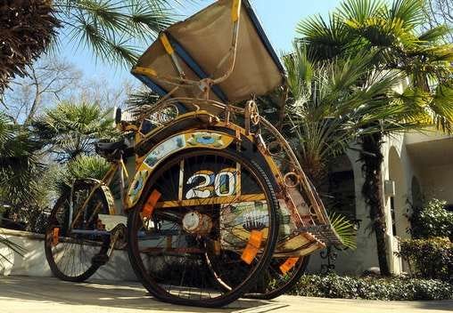 I’m not precisely sure what Morris’ wife is wearing in this photo (Barbarella’s coronation gown? Or, as a reader suggests, a shower curtain trimmed with fake fur?), but the caption reads “Susan Starr models a jacket she made in her studio at her home in Montgomery, Ala.”This shiny thing-a-mabob with the #20 on it is described as “A poolside rickshaw at the home of Morris Dees and Susan Starr in Montgomery, Ala,” because nothing screams Equality! like a fancy rickshaw.