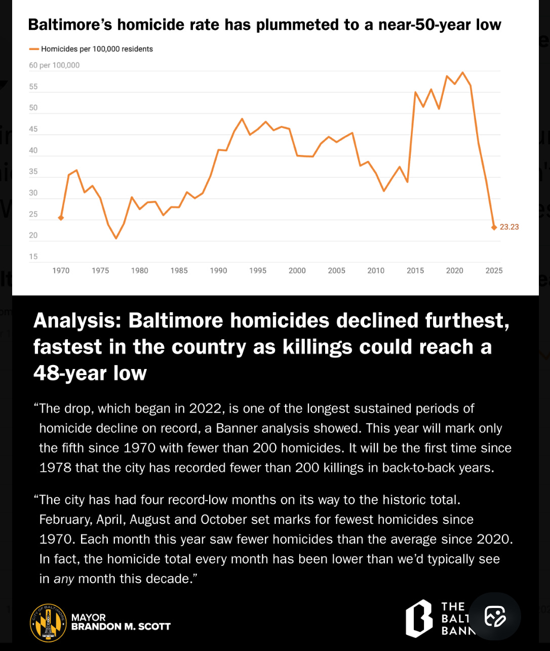 Well, that’s good news. The murder rate in Baltimore is now only slightly worse than in 1977, the year after Taxi Driver, which everybody recognizes as a year of harmony and tranquility.