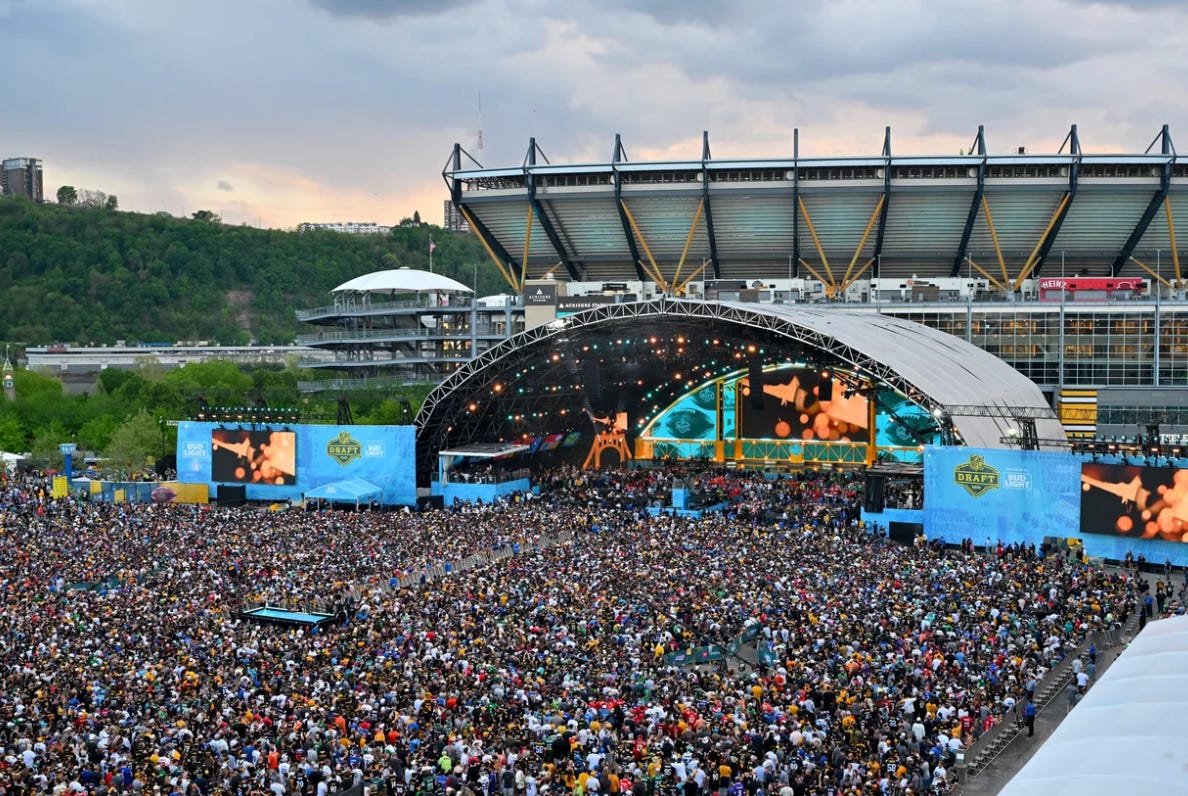 One of the the less expected social phenomenon of the last two generations has been the unstoppable growth of the National Football League draft of college players as a spectator event. The NFL draft visited Pittsburgh last week, and the first day drew 320,000 spectators to hear the names of the 32 first round picks being read off. It’s like a Woodstock-sized crowd showing up for a chess match … on a Thursday in April in Pittsburgh.