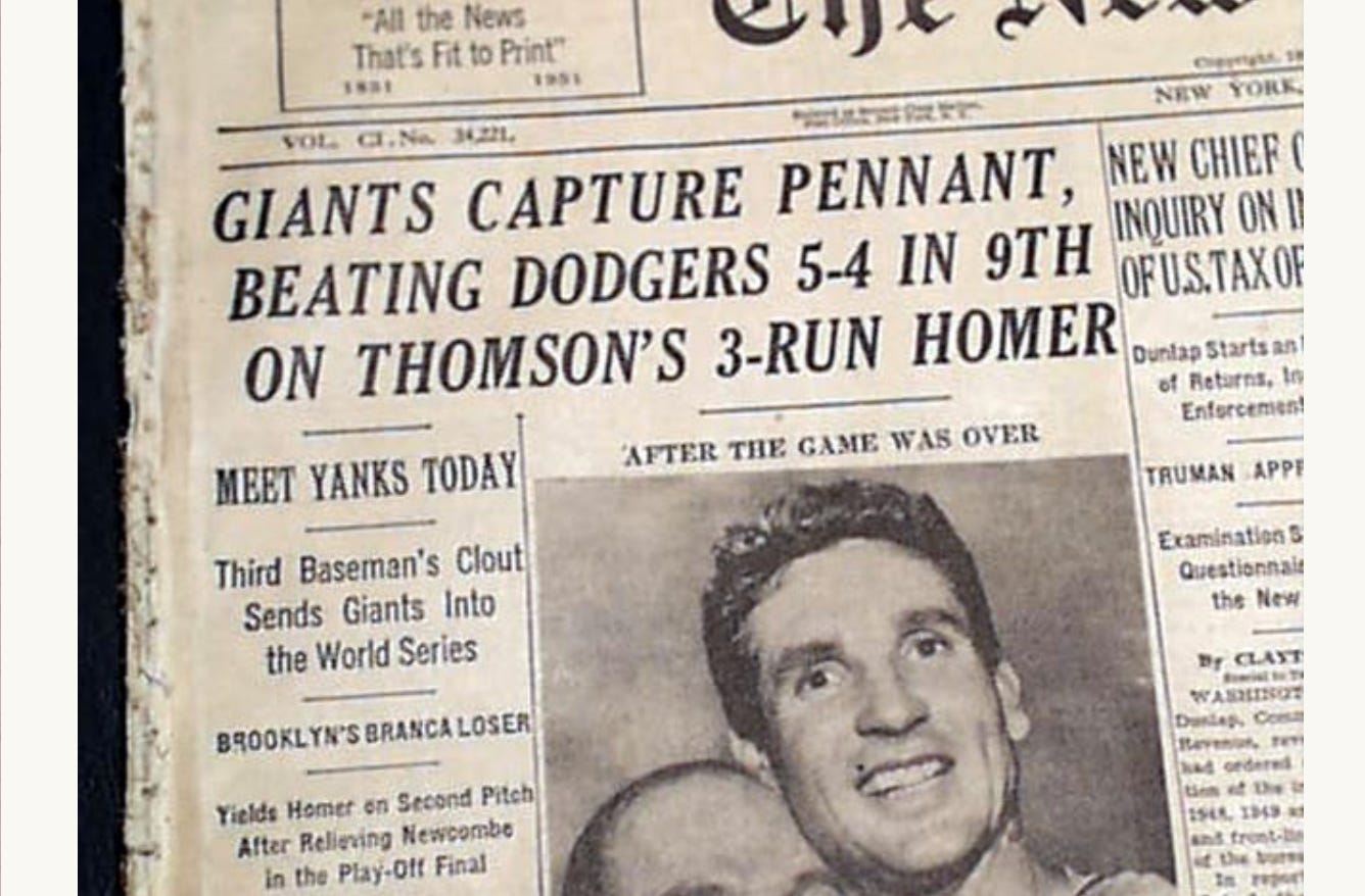 … they were of more value to newspaper headline writers: e.g., “Giants Capture Pennant, Beating Dodgers 5-4 in 9th on Thomson’s 3-Run Homer.” A player can earn up to four RBIs in one at-bat but can score only one run, so RBIs tend more often to be the dramatic turning point to highlight in the opening of an article on today’s game. For example, in the Shot Heard Around the World Game that decided the 1951 National League pennant in a tiebreaker playoff, Bobby Thomson had 4 RBIs, but all 5 runs scored by the New York Giants were scored by different players.