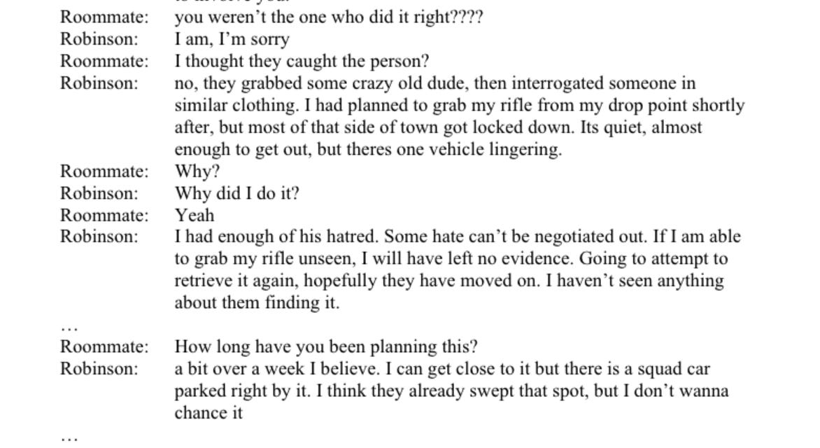 … Police interviewed Robinson’s roommate, a biological male who was involved in a romantic relationship with Robinson. The roommate told police that the roommate received messages from Robinson about the shooting and provided those messages to police. On September 10, 2025, the roommate received a text message from Robinson which said, “drop what you are doing, look under my keyboard.” The roommate looked under the keyboard and found a note that stated, “I had the opportunity to take out Charlie Kirk and I’m going to take it.” Police found a photograph of this note. The following text exchange then took place.