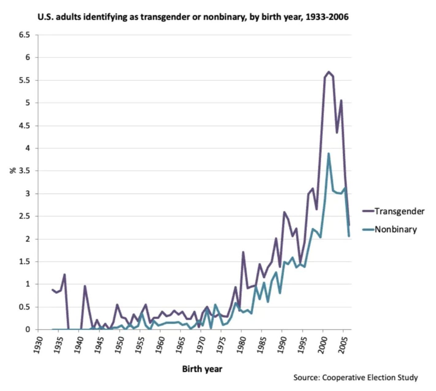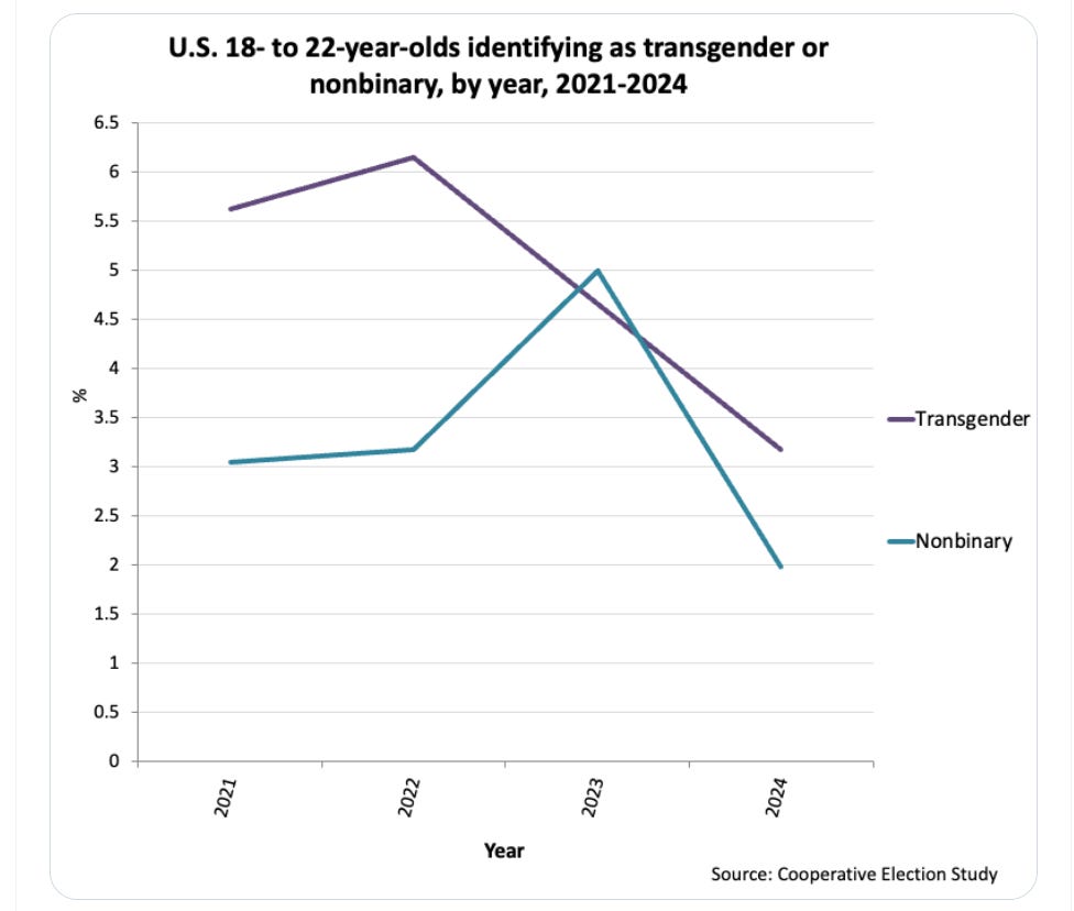 Among American 18-22 year olds in 2022, 9.5% (eyeballed from this graph below) claimed trans or nonbinary identify in 2022 (6.3% trans and 3.2% nonbinary) vs. 5.4% (3.4% trans and 2.0% NB) in 2024, a decline of 43% in two years.