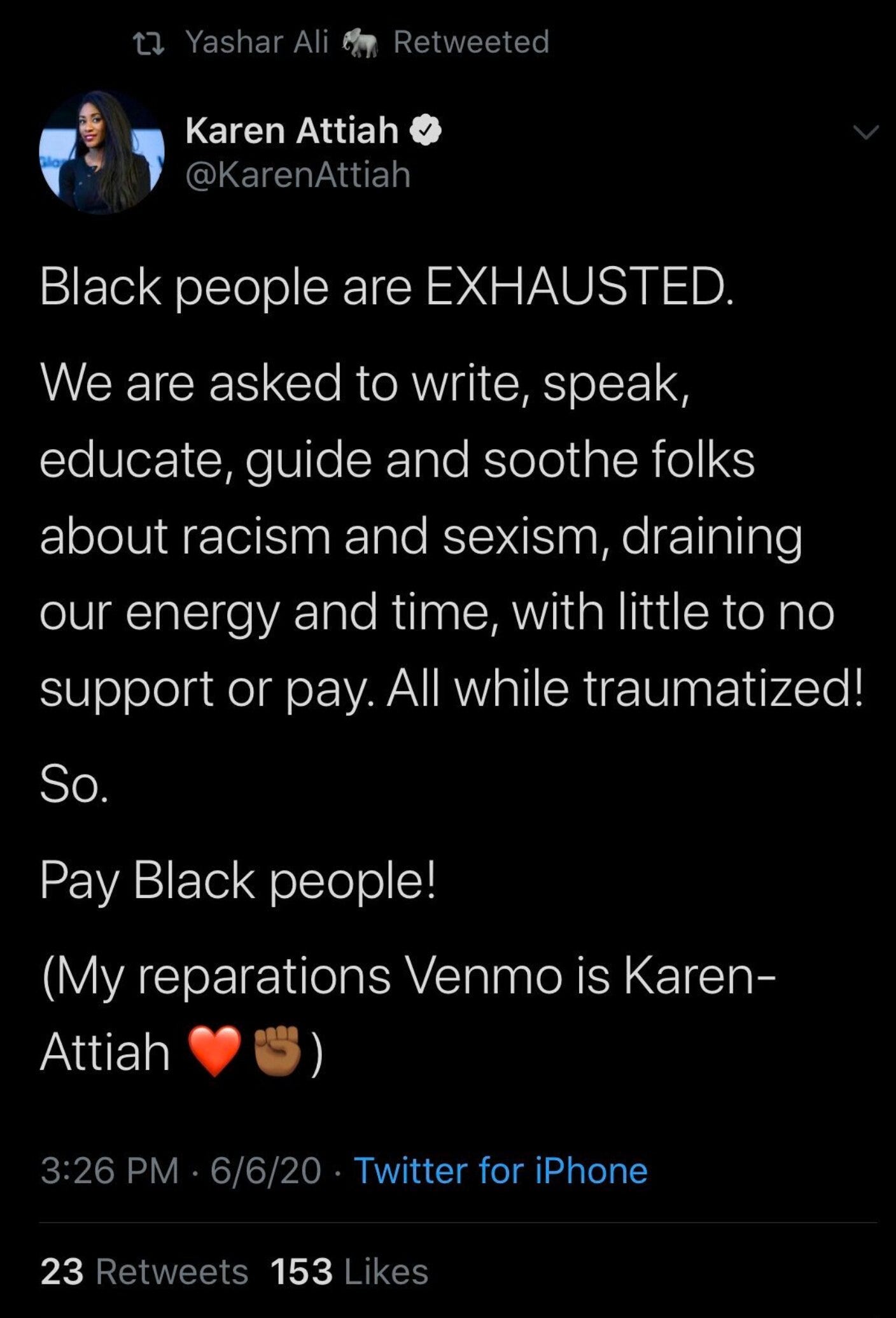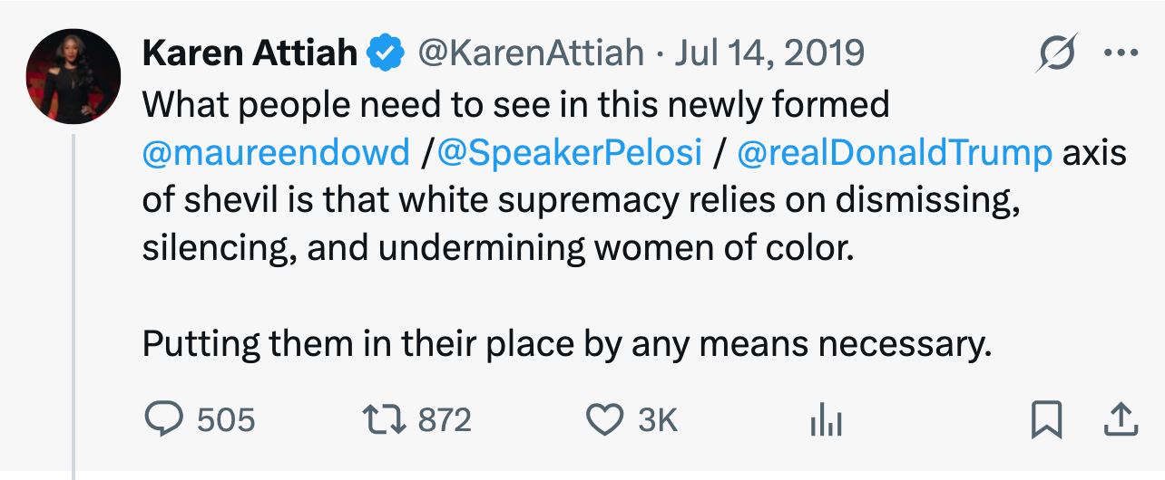 I want to strenuously protest the Washington Post firing its hilariously racist Global Opinions Editor, Karen Attiah, after she altered a Charlie Kirk quote. For years, Ms. Attiah has used the pages of this national newspaper to rant about her hatred for whites, men, and especially for white women, providing me with numerous easy examples of how insane the mainstream media had gotten during the Racial Reckoning.